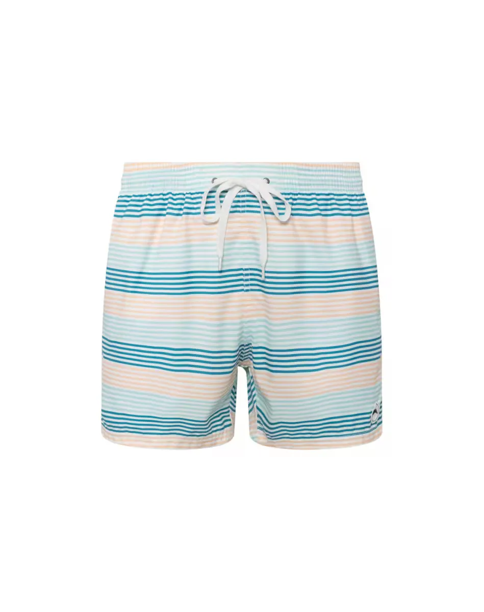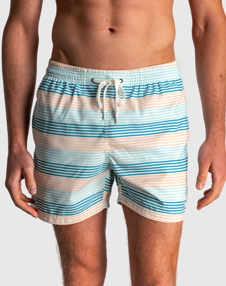 Купальник с эластичной резинкой на талии, разноцветным полосатым принтом, боковыми и задними карманами, внутренней ширинкой и быстросохнущей внешней тканью.