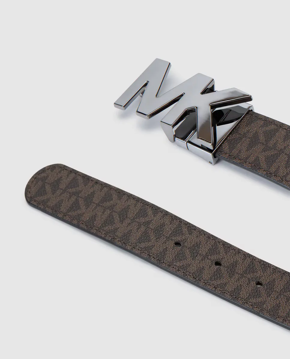 Этот потрясающий кожаный ремень оснащен нашей элегантной пряжкой MK и имеет тонкий принт с логотипом, создающий фирменный штрих. Двусторонний ремень выполнен из гладкой кожи.