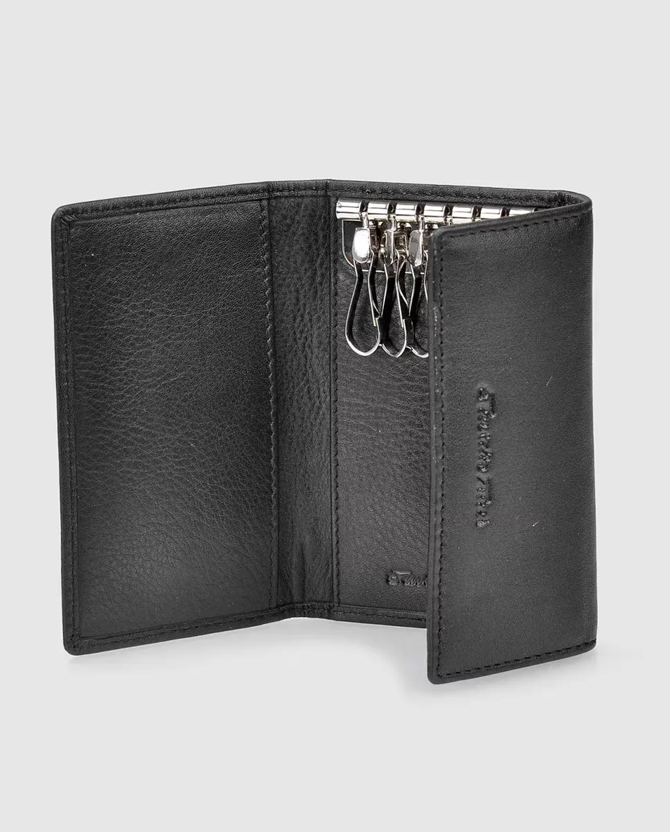 Брелок из гладкой черной кожи с карабином на восемь ключей. Закрывается на застежку.