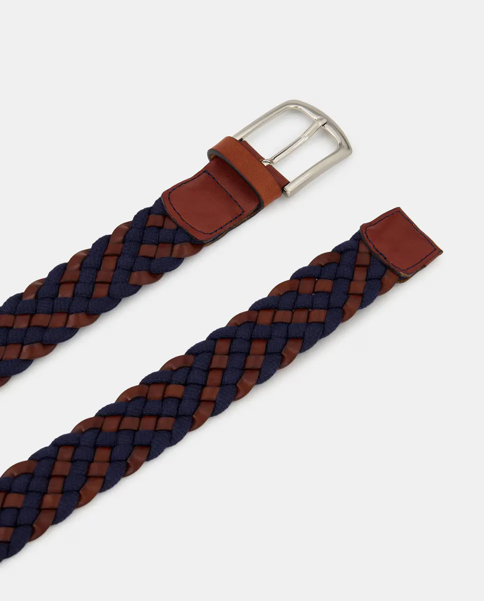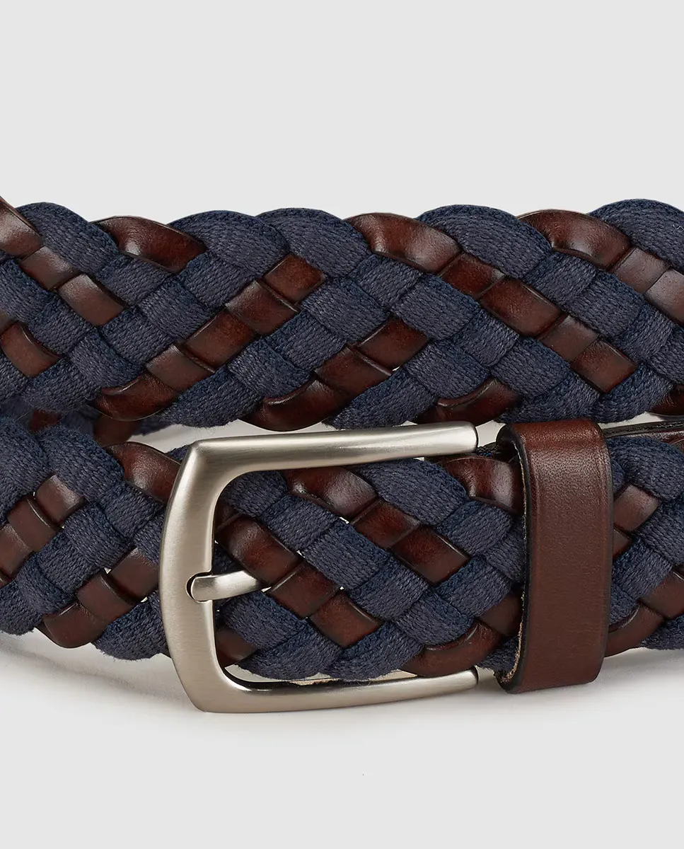 Ремень шириной 35 мм из ткани темно-синего цвета и кожи с плетением. Имеет квадратную пряжку.