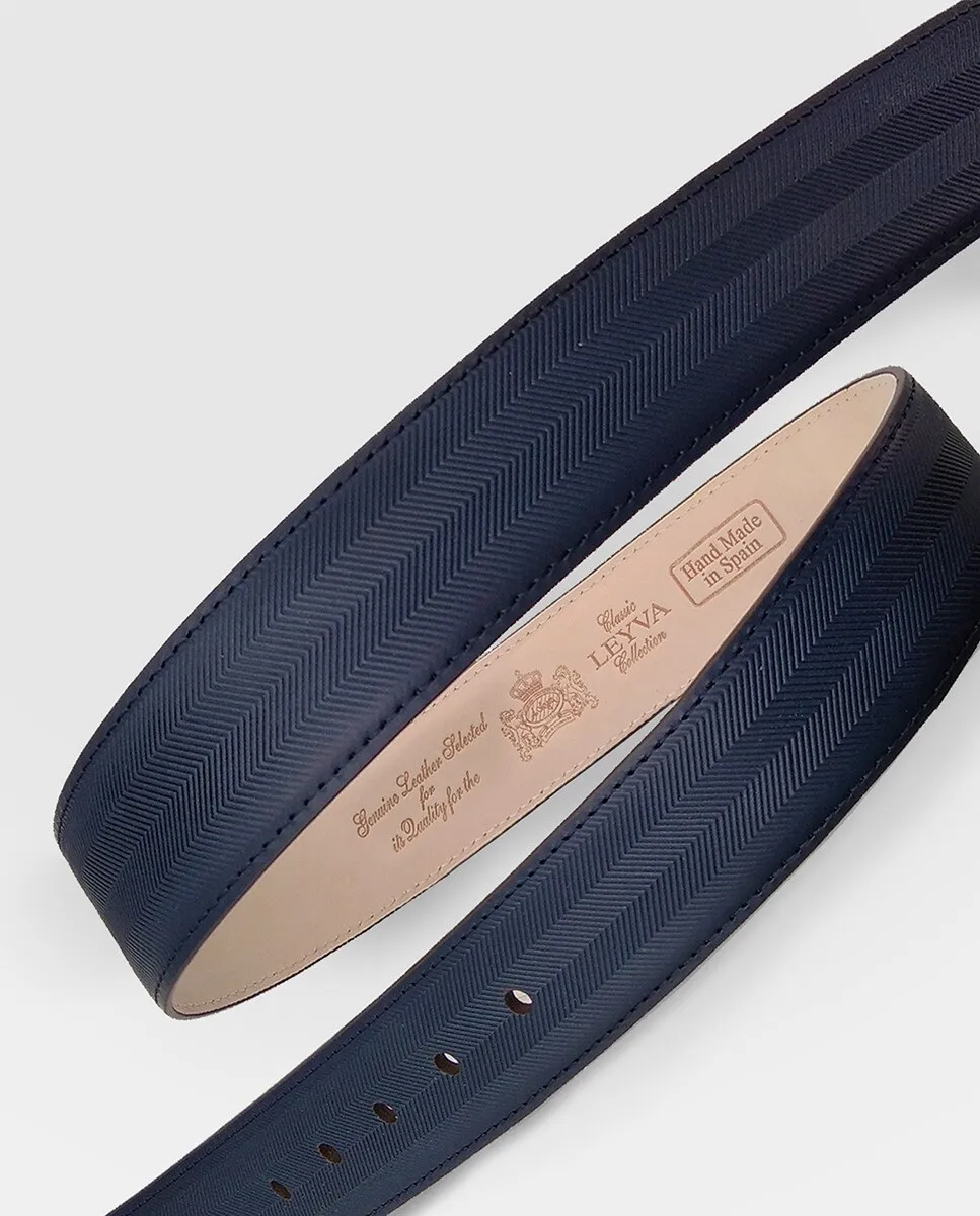Мужской ремень LEYVA. Изготовлен шириной 35 мм из темно-синей кожи. Гравированная текстура «елочка» на лицевой стороне и подкладка из нубука. 100% говядина. С системой сокращения. Атласная серебряная пряжка. Сделано в Испании.