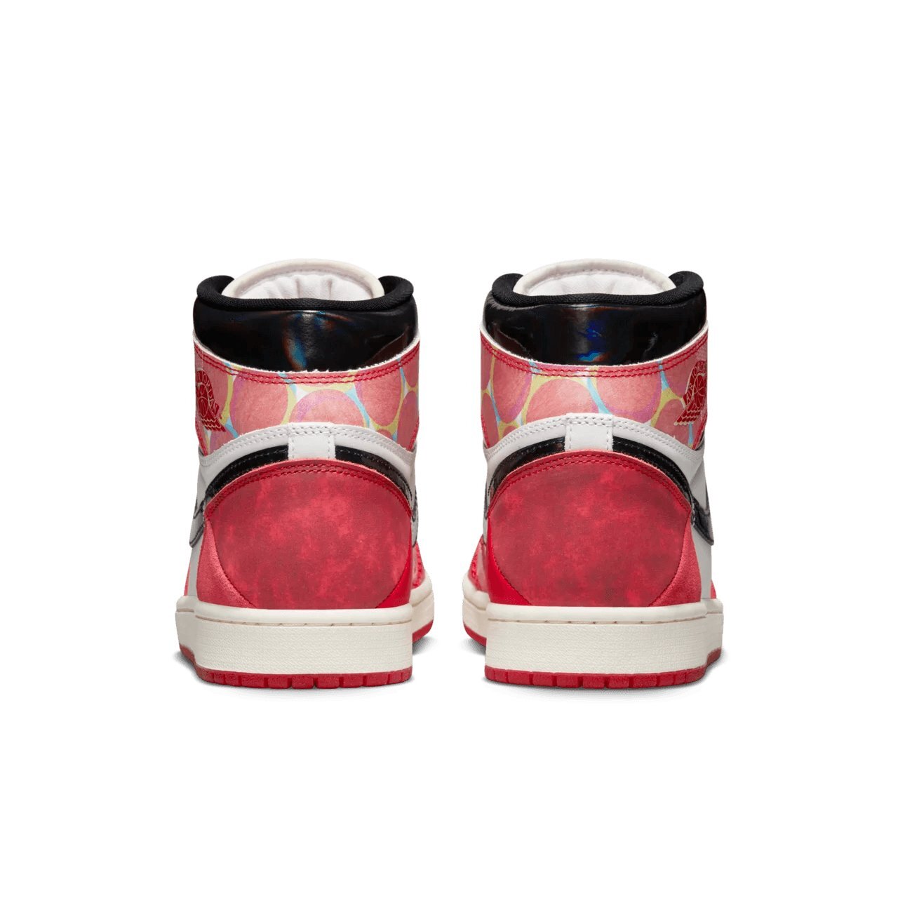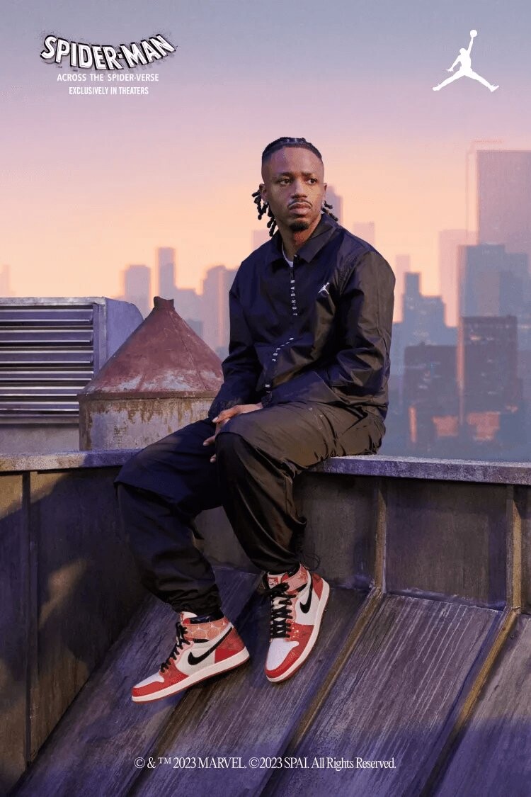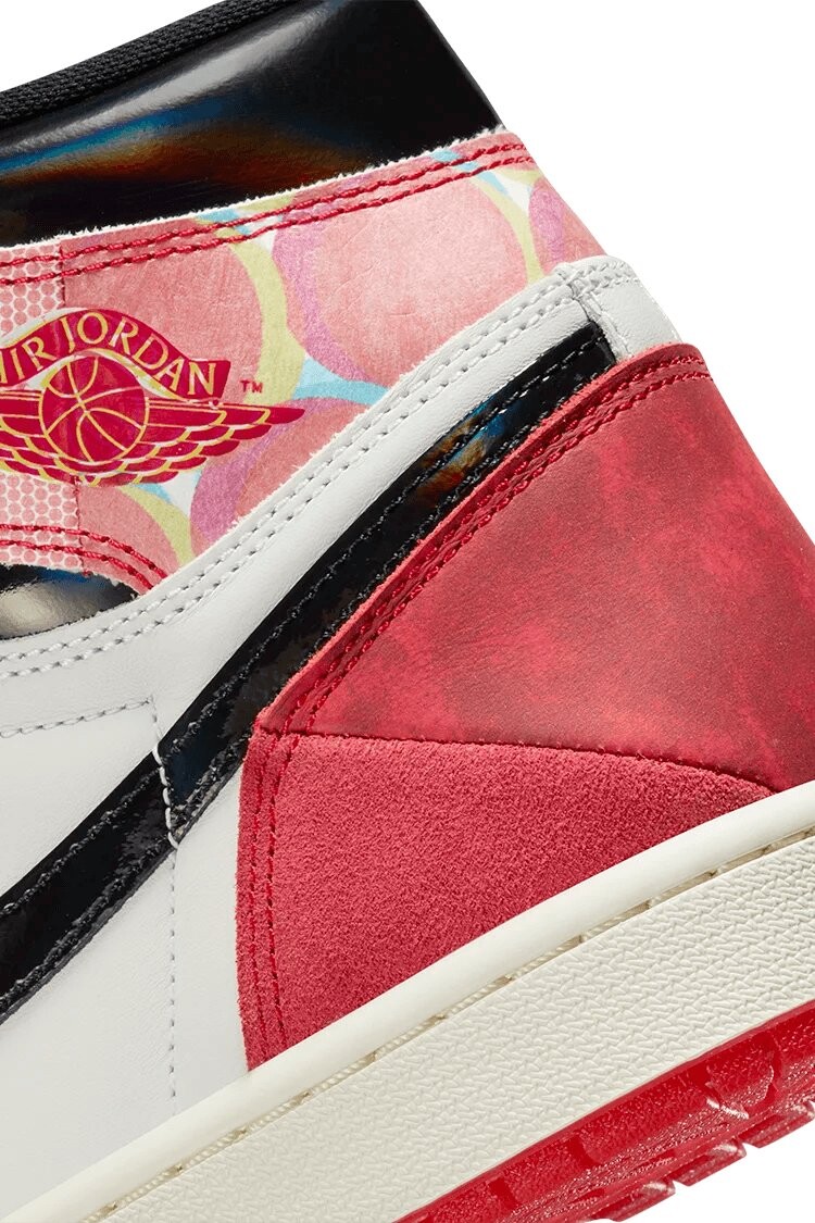 Marvel x Air Jordan 1 Retro High OG «Next Chapter» — это коллаборация, цветовая гамма которой вдохновлена анимационным фильмом «Человек-паук: Через вселенные». Эта версия культовой модели кроссовок представляет собой творческую интерпретацию классической цветовой гаммы «Чикаго» с белым кожаным верхом и черной лакированной кожей на фирменном логотипе Swoosh и воротнике. Алые накладки представляют собой комбинацию различных текстур и принтов, соединенных вместе, чтобы создать уникальный дизайн, отсылающий к сложной природе вселенной Человека-паука. Обувь поддерживается резиновой чашечной подошвой, которая сочетает в себе состаренные боковые стенки и малиновую полупрозрачную резиновую подошву. Ярлык украшает бирка Nike из тканого нейлона, а на боковой планке воротника выштампован ретро-логотип Wings.