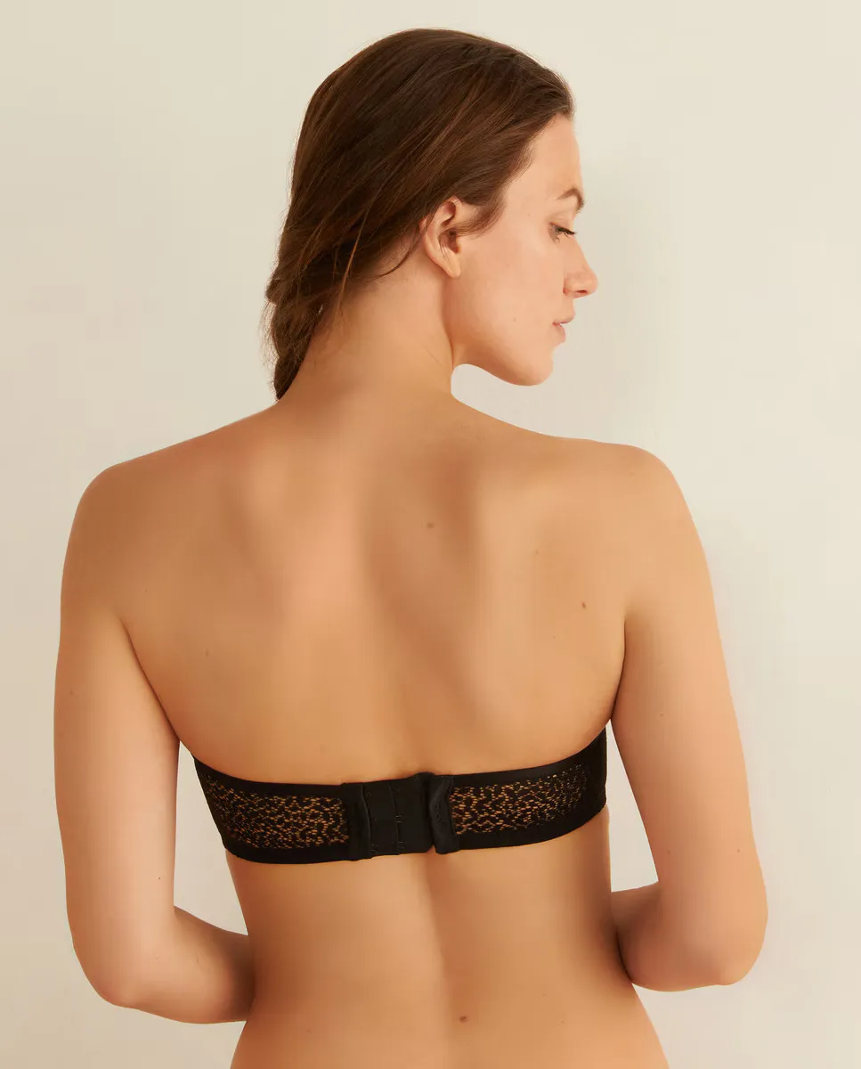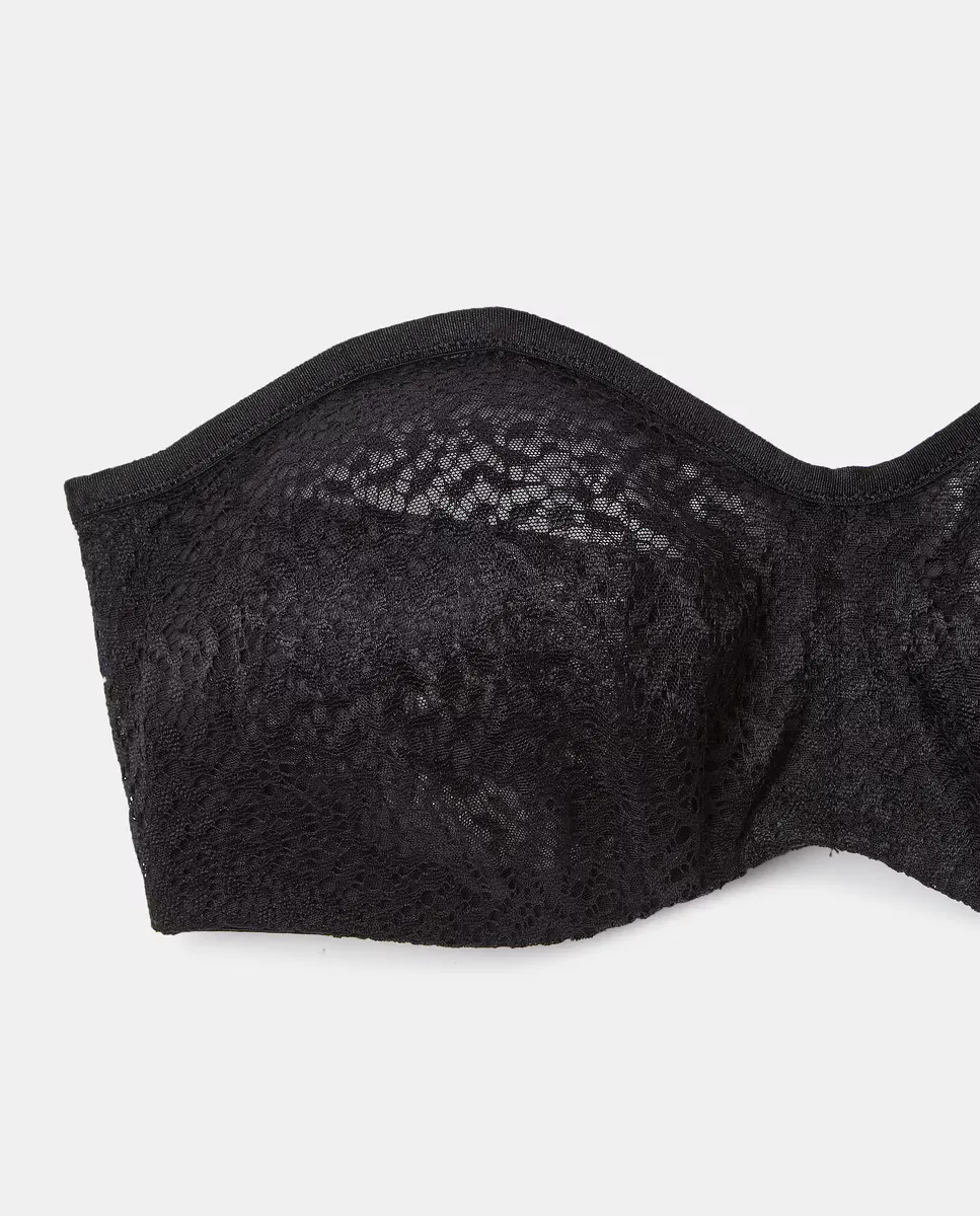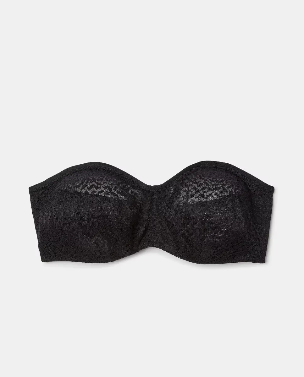 Бюстгальтер без бретелек на косточках и геометрическим кружевом на чашках.