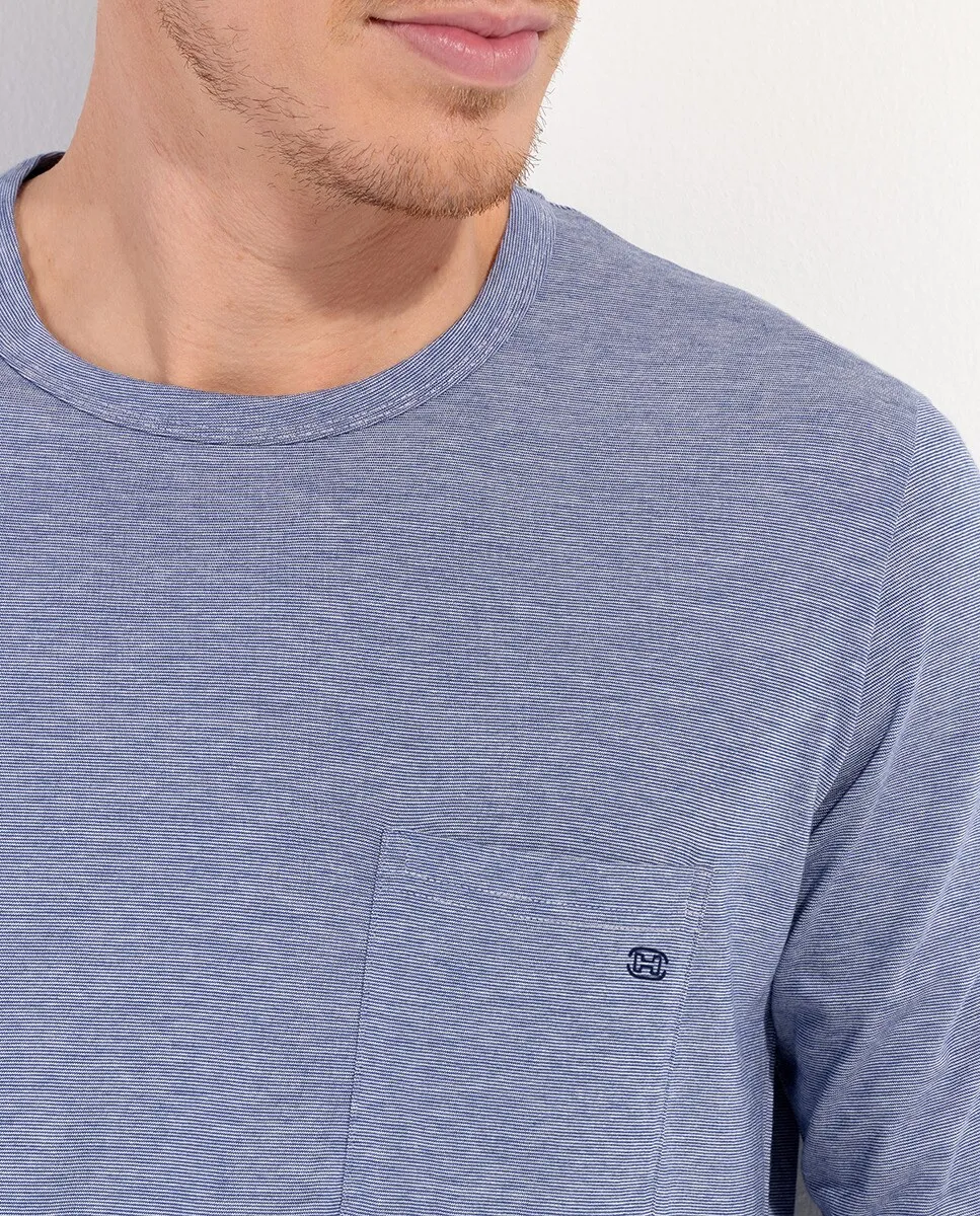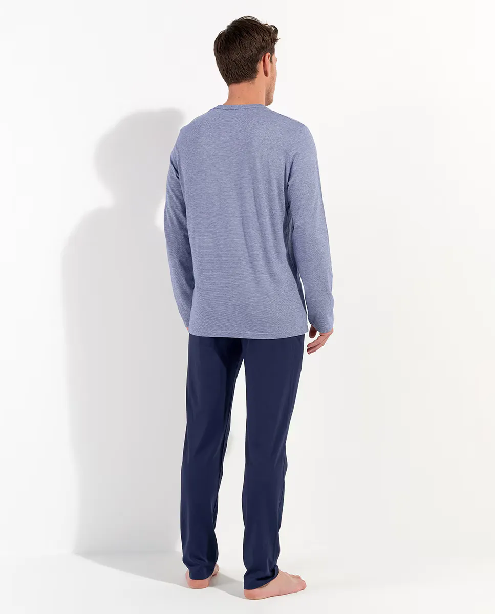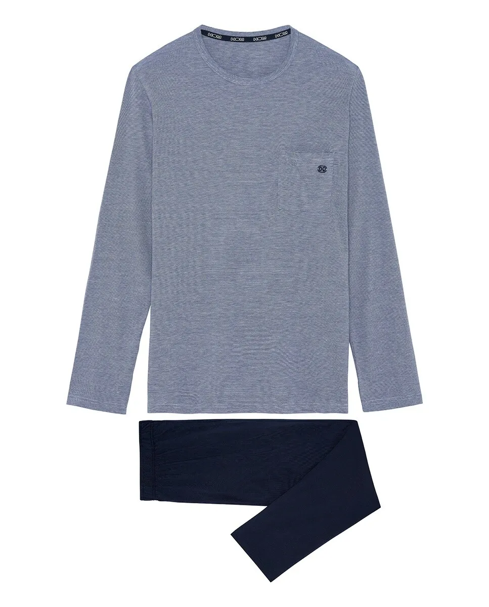 Вязаная пижама, состоящая из футболки с длинными рукавами и круглым вырезом синего цвета индиго и длинных темно-синих брюк. На груди футболки имеется практичный накладной карман. Очень мягкая приятная ткань.