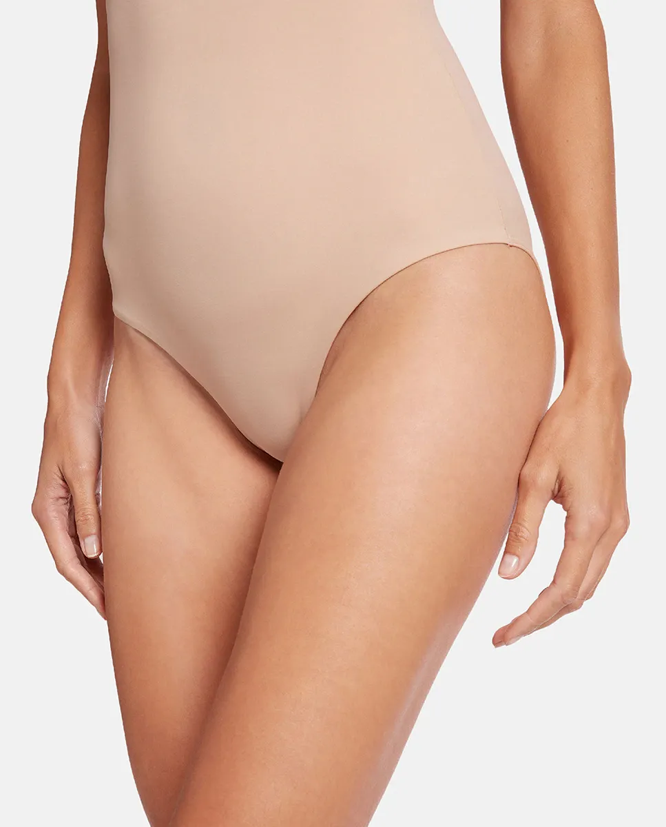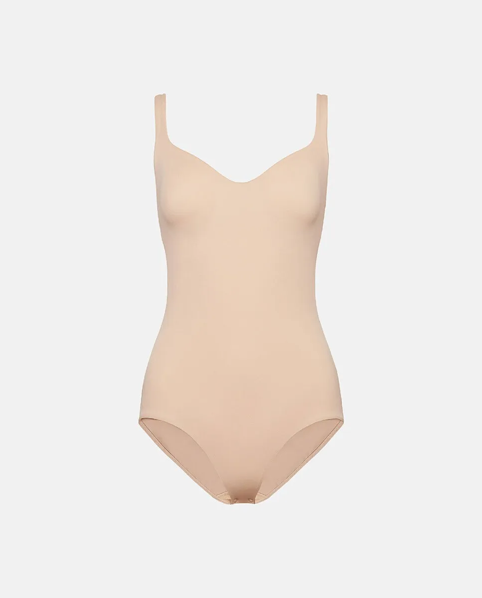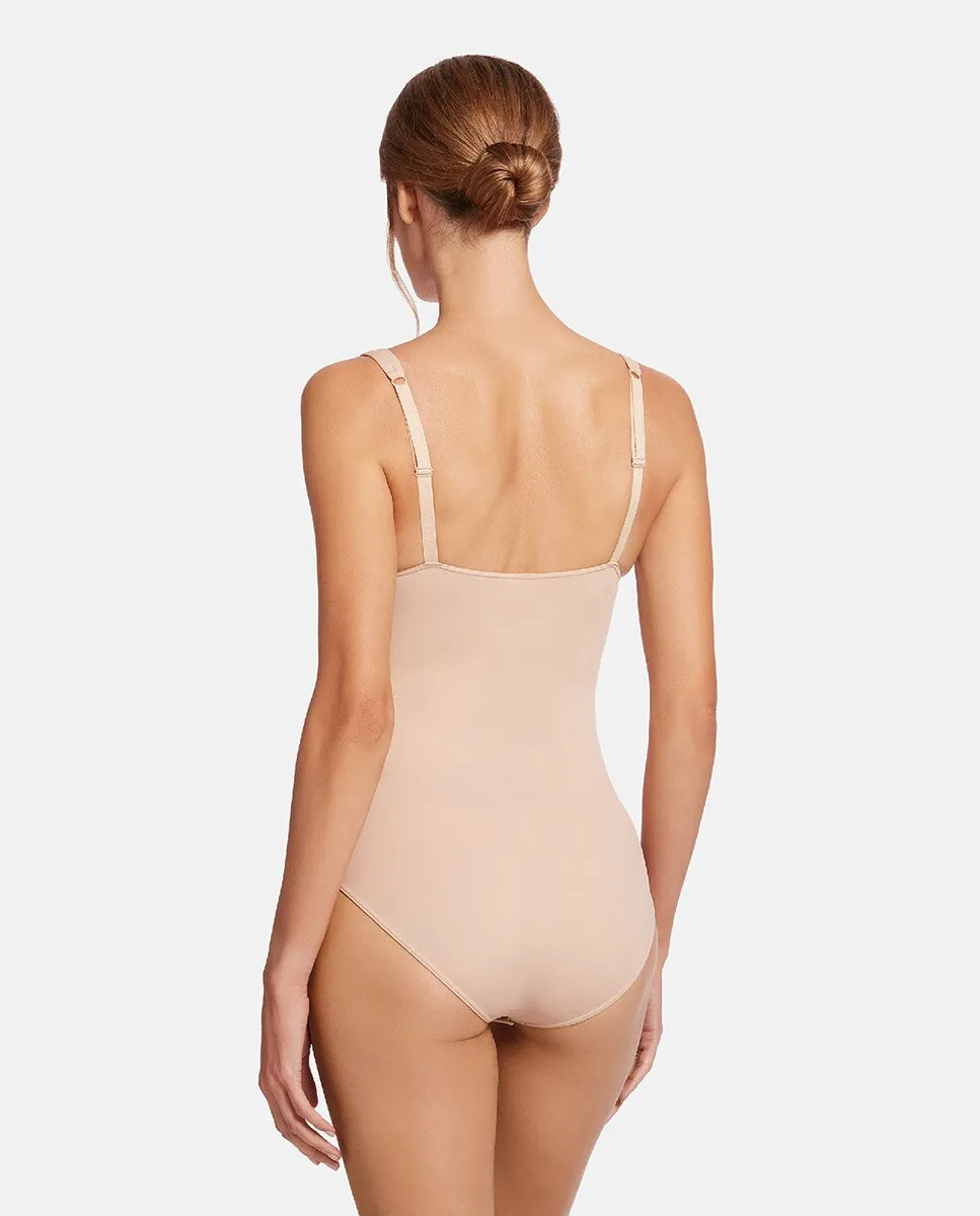 Пуристический и очень стильный. Это боди моделирует силуэт и впечатляет своим лаконичным внешним видом. Встроенные невидимые чашки и косточки обеспечивают поддержку и позволяют продемонстрировать идеальный вырез. Со встроенными косточками / Передняя часть усилена тканью лифа