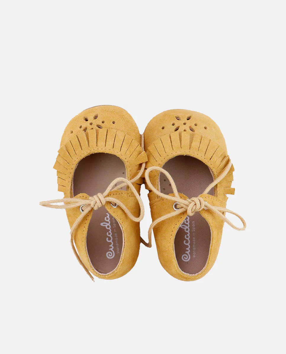 Одна из сладостей сезона, которая подойдет самым модным ножкам. Маленькая туфля с бахромой из коллекции CUCADA, которая сопровождает ноги размером от 17, когда они обретают уверенность при ходьбе, так что постепенно они укрепляются и свободно развиваются, но защищают их на каждом шагу. Изготовлен из очень мягкой замши, с подкладкой из высококачественной дышащей козьей кожи. Застежка с соответствующими шнурками сверху придает эффектный дизайн. Разработаны и изготовлены в Виллена, со стилем и сохранением всех важных характеристик посадки и устойчивости здоровой обуви для первых путешественников. Широкая колодка дает вашим мизинцам полную свободу, а плоская резиновая подошва не скользит и гибка, но устойчива к любой поверхности. Сделайте ставку на традиционную обувь, улучшенную благодаря достижениям многолетних традиций, для сегодняшних детей. Качественная обувь – это инвестиция в устойчивое развитие. Доступны размеры от 18 до 25. Они соответствуют размеру. Сделано вручную в Испании с любовью.