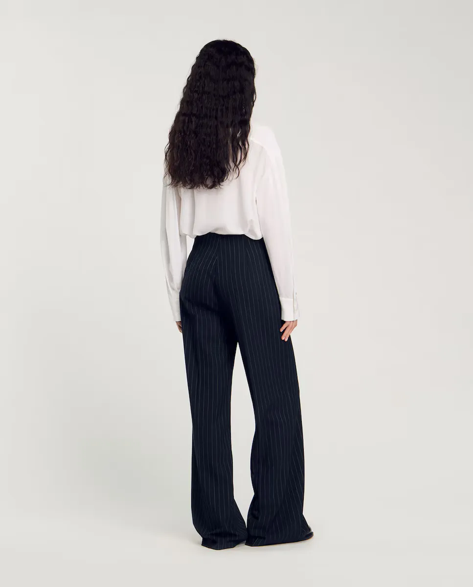 Прямые широкие брюки, украшенные мелким принтом в теннисные полоски, со складками сзади и прорезными карманами. Прямые брюки Sandro Femme. Теннисные полоски. Клипсы на спине. Выраженные складки. Застежка-молния Эти брюки соответствуют верху.