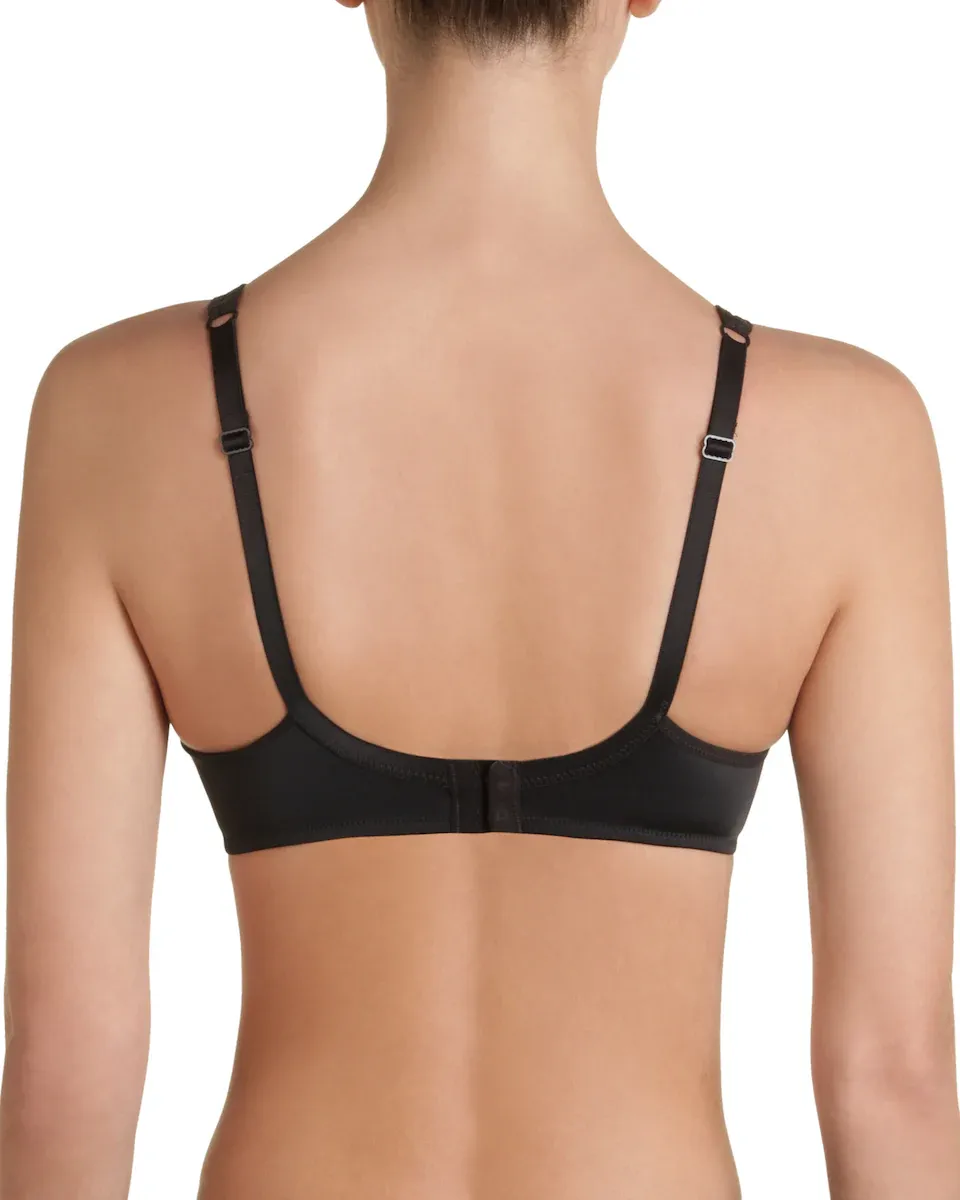Беспроводной бюстгальтер большой емкости. Чашка из 2 частей с центральным швом, обеспечивающим фронтальную поддержку груди. Внутренняя часть чашек и каркаса покрыты блокированной полиамидной сеткой, обеспечивающей полную поддержку. Чашки отделаны тюлем. Непрерывные широкие бретели из тюля. Закругленная спинка, 2 застежки, 3 позиции.
