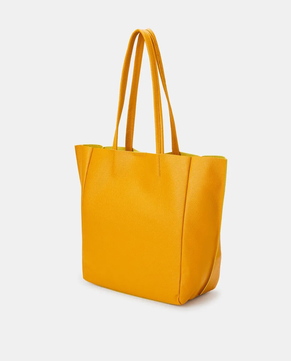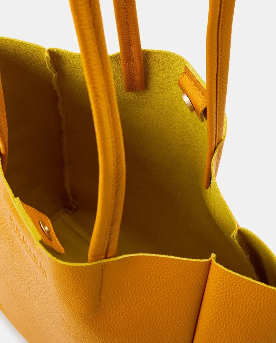 Сумка-шоппер размера XL горчичного цвета из воловьей кожи с застежкой-клипсой. В комплект входят две нерегулируемые плечевые ручки.