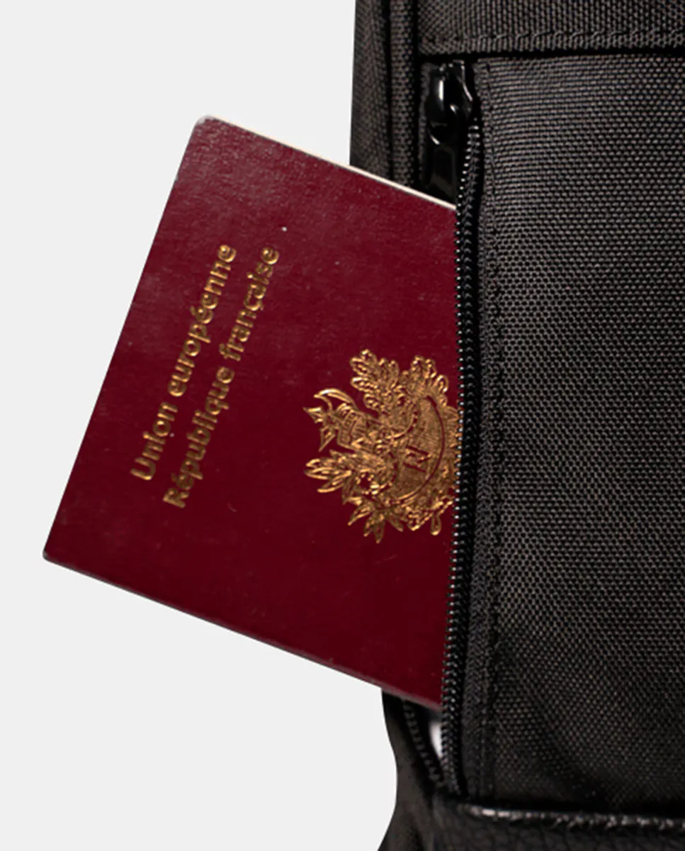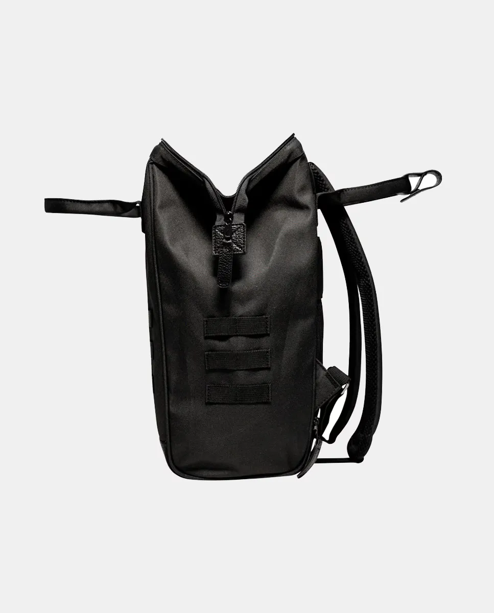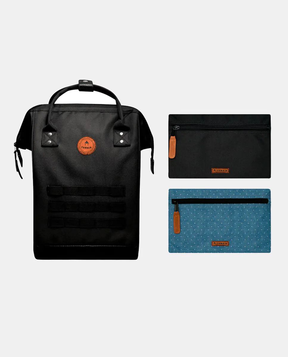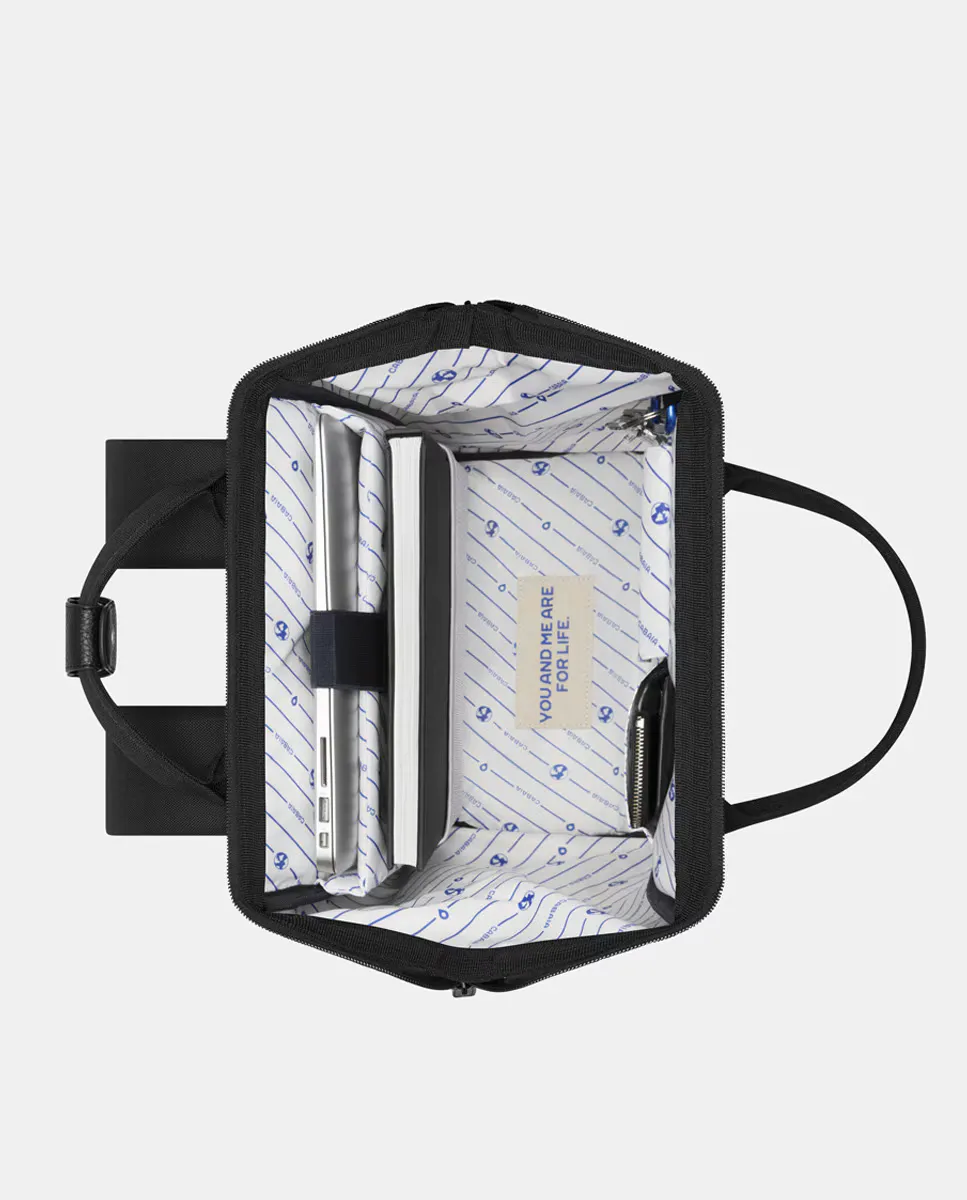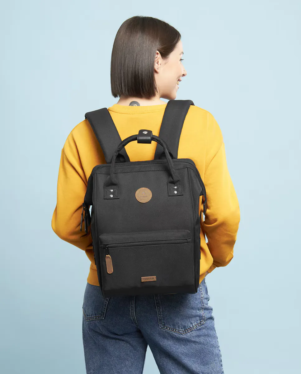 Черный рюкзак с фирменной этикеткой Cabaia спереди, застежкой-молнией сверху, широкоугольным отверстием и двумя верхними ручками. Он содержит два сменных внешних передних кармана (черного и синего цвета) с запатентованной системой защиты от кражи: системой MOLLE. Ремни с защитой от пота. Легко чистящаяся основа из кожзаменителя. Внутри имеется карман для ноутбука с диагональю 13 дюймов, держатель для ключей и небольшой потайной карман для хранения вещей. Водоотталкивающий.