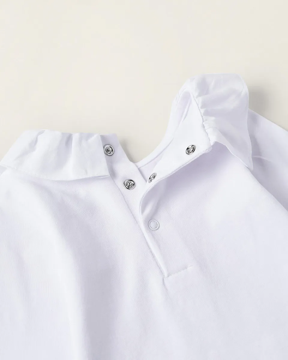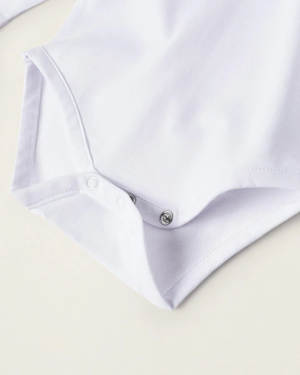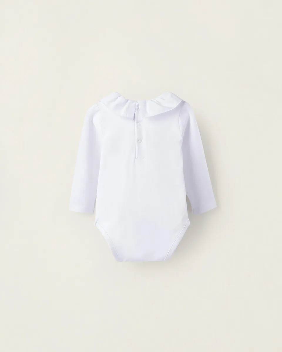 Белое боди с длинными рукавами для новорожденного из хлопкового трикотажа с эластаном для большего комфорта. Воротник с рюшами. С кнопками на спине и в промежности для удобного одевания и смены подгузников. Печатная внутренняя этикетка, чтобы избежать раздражения кожи. Удобное и красивое боди классического кроя, идеально подходящее для первых месяцев жизни ребенка.