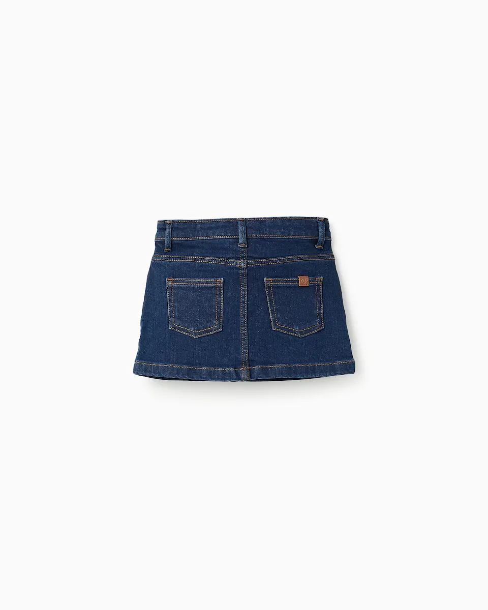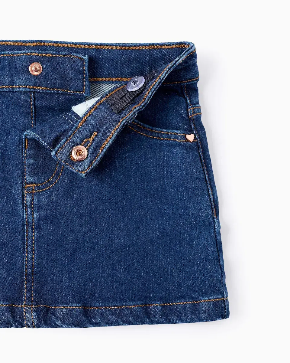 Мини-юбка из джинсовой ткани для девочек из хлопка с добавлением эластана для большего комфорта и свободы движений. Регулируемая талия с помощью резинок и пуговиц. Пять карманов. Для повседневного и современного образа.
