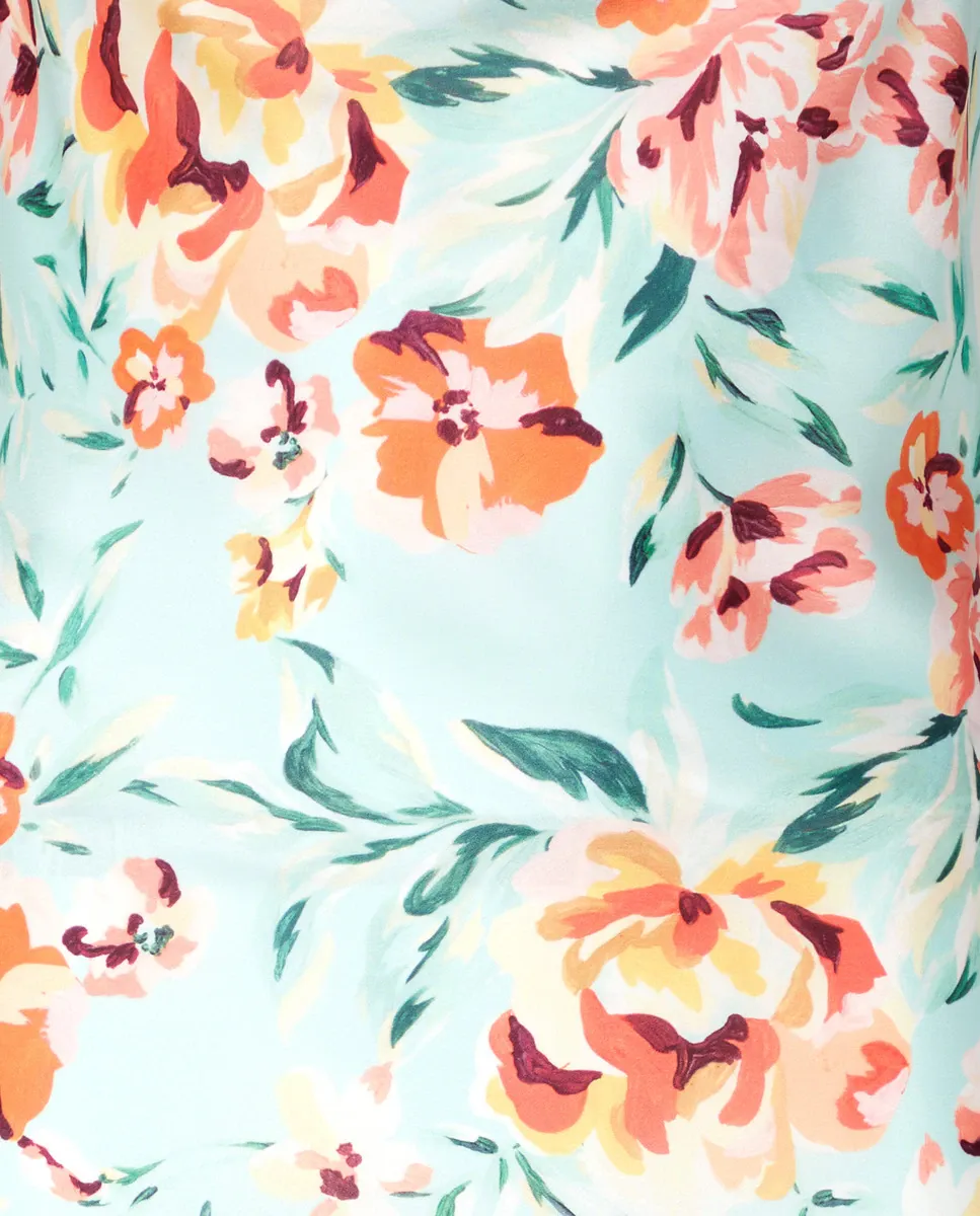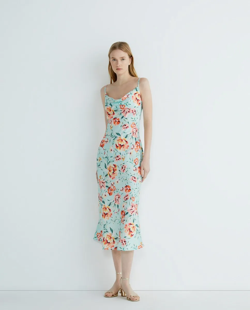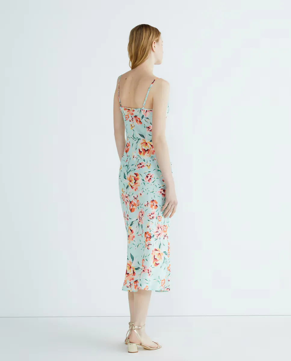 Длинное струящееся платье без бретелек с цветочным принтом.