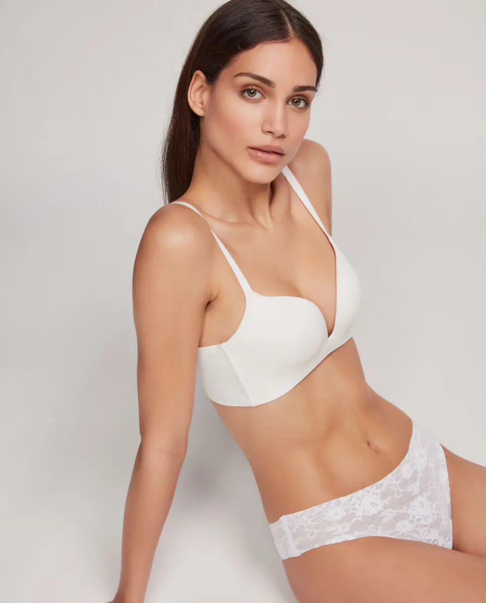 Бюстгальтер без косточек, с поролоном и чашками с эффектом пуш-ап. Экстремальный вырез идеально подходит для одежды с очень глубоким вырезом и отделкой на «мягкой подкладке». Ламинированные плечи с немаркирующими термосварными резинками. Очень мягкие регулируемые бретели с возможностью их изгиба и 4-позиционной застежкой сзади. Доступен в 3 цветах. Сочетайте его с подходящими трусиками.
