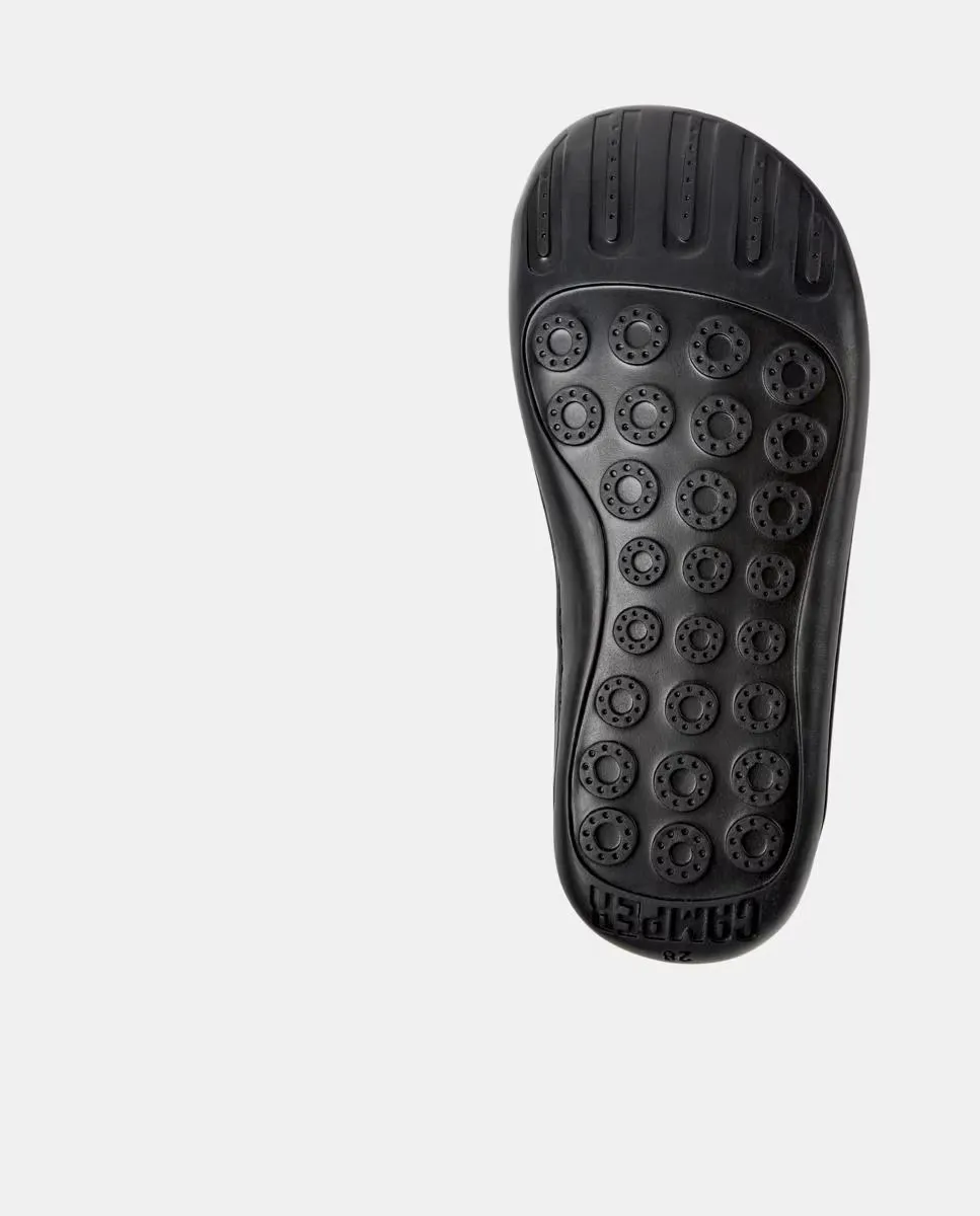 Детские открытые черные кожаные туфли с эластичными шнурками, стельками из ЭВА и резиновой подошвой. Символ Camper, который меняется каждый сезон. Peu прославляет функциональную простоту и вдохновляется удовольствием ходить босиком. Он имеет шов по всему краю и был создан с использованием технологии Strobel, которая гарантирует непревзойденную гибкость и долговечность в любой ситуации.