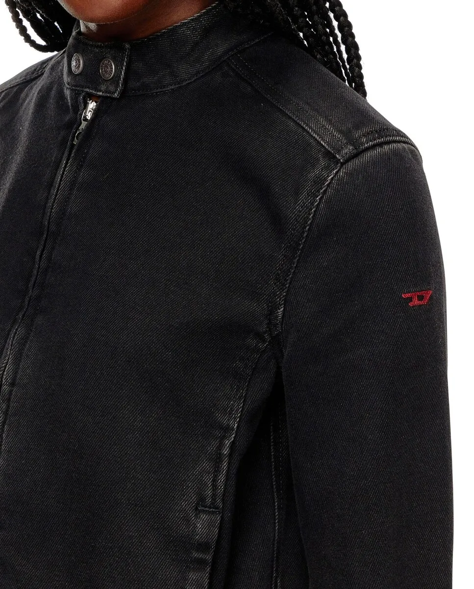 Эта женская куртка, вдохновленная байкерскими силуэтами, изготовлена ​​из частично переработанного черного денима из 100 % хлопка. Чистый, строгий силуэт украшен маленькой буквой D, вышитой красной нитью на одном рукаве.
