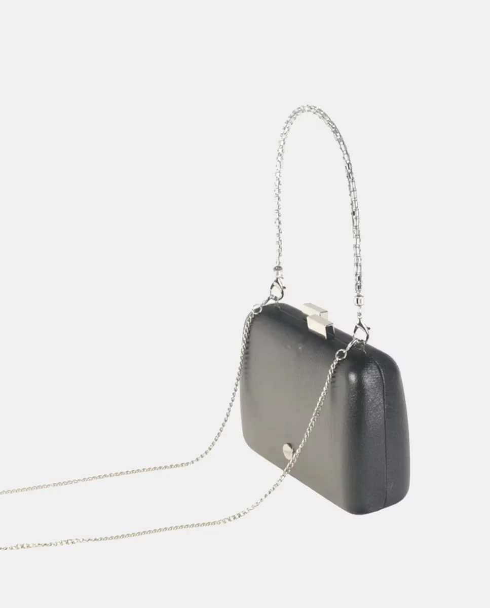 Жесткая коробка в стиле клатча, выполненная в черном цвете с легкой фактурой. Эта модель состоит из открывающегося мундштука кошелькового типа, состоящего из двух никелевых металлических прямоугольников, которые придают изделию свет, в сочетании с ручкой, образованной маленькими прямоугольными кристаллами и круглыми надрывами, придающими ощущение вечеринки. Эта модель имеет дополнительную металлическую ручку и объемный мини-логотип сзади.