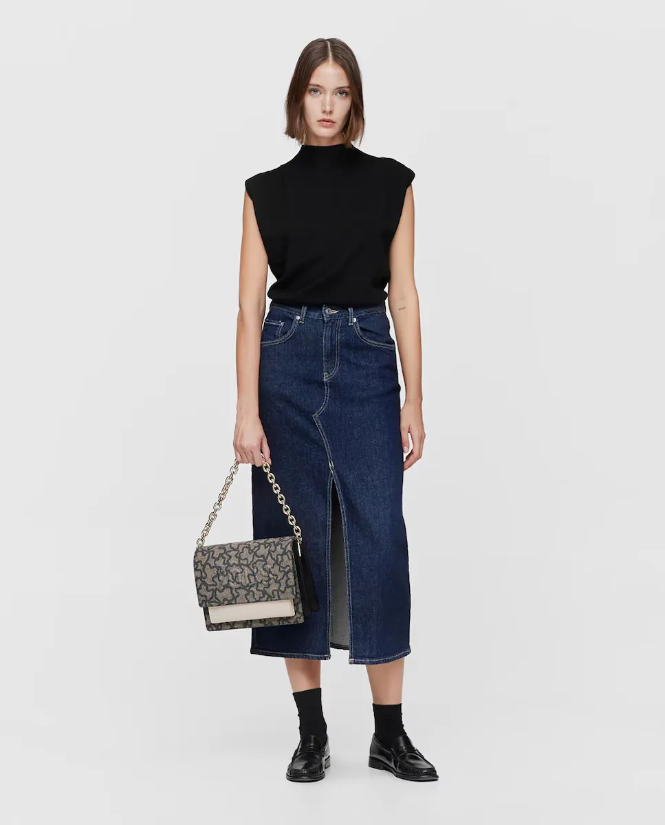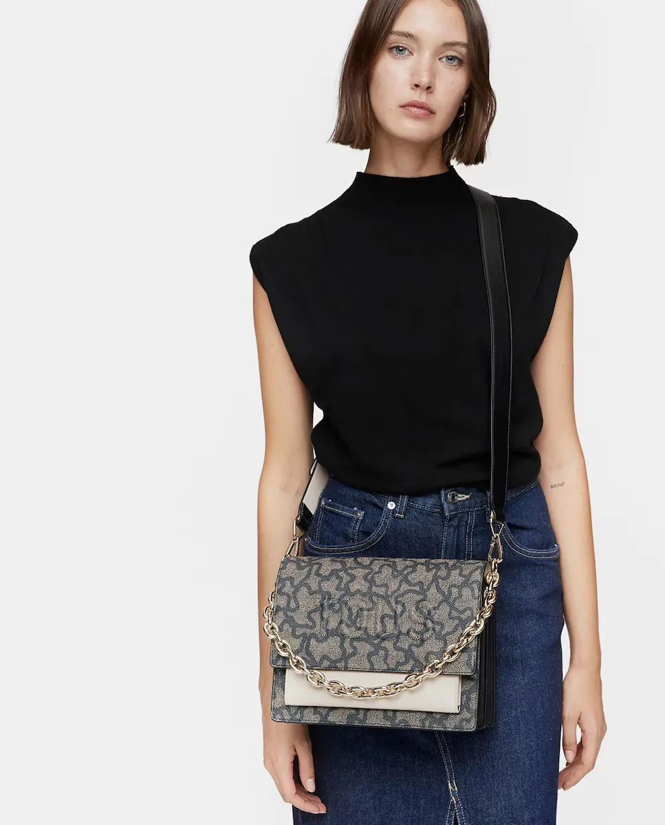 Сумка через плечо или через плечо Audree TOUS Kaos Icon из черной канвы с принтом Kaos и деталями из полиуретана. Сумка с двумя отделениями, разделенными карманом на молнии и открытым внешним карманом спереди. Застежка-клапан на две магнитные кнопки. Фиксированный плечевой ремень-цепочка и регулируемый съемный ремень через плечо. Размеры (высота х ширина х глубина): 20 х 25 х 12 см.