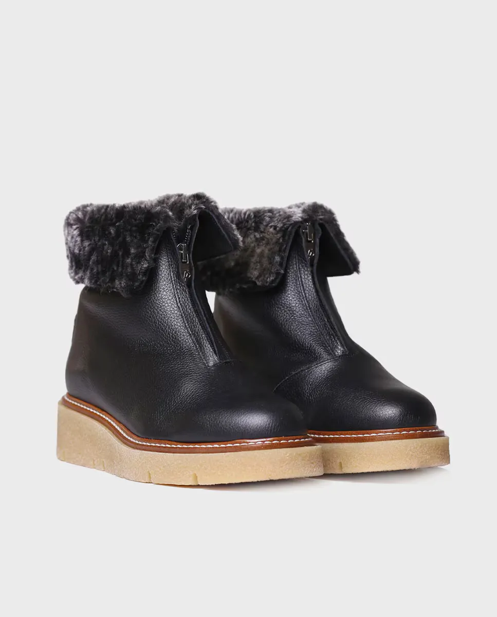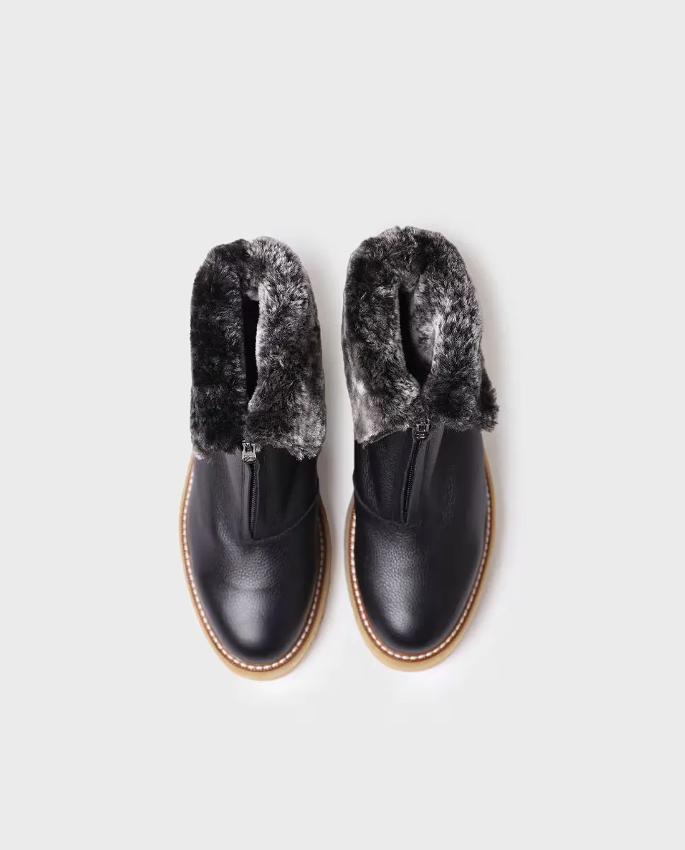 НАНДА-ПО. Женские ботинки изготовлены из кожи и имеют внутреннюю подкладку из мягкого синтетического меха. Подошва изготовлена ​​из нескользящей резины и имеет высоту 5,5 см. Застежка-молния спереди. Эта модель соответствует обычному размеру. Если вы выбираете между двумя размерами, выберите больший размер.
