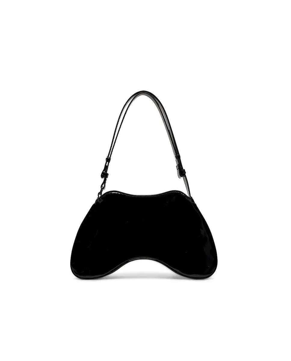 Эта женская армейская сумка элегантна и при этом интересна благодаря своей игривой асимметричной форме, вдохновленной контроллерами видеоигр. Эта сумка с гладкой блестящей отделкой изготовлена ​​из переработанных материалов, имеет верхнюю часть на молнии и изящную металлическую деталь в форме буквы D. Ремешок регулируется по размеру.