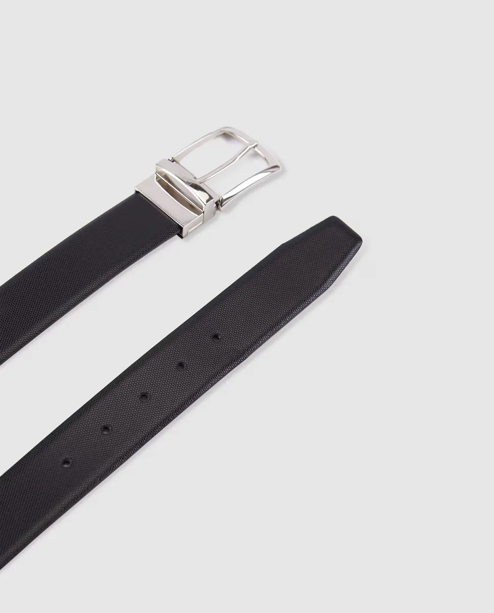 Двусторонний черный кожаный ремень с металлической пряжкой.