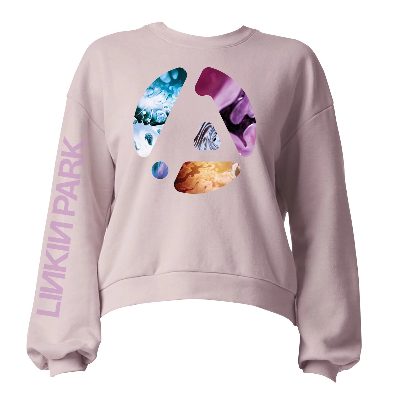 Женский свитшот из флиса цвета орхидеи с рукавами-баллонами и рисунком From Zero спереди и надписью "LINKIN PARK" на правом рукаве.