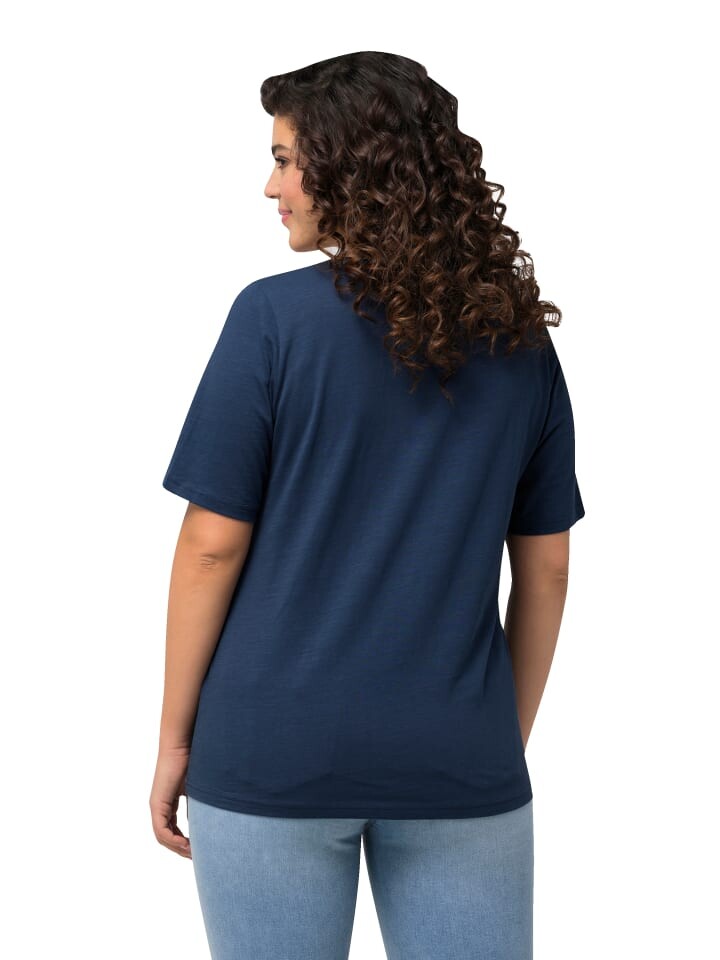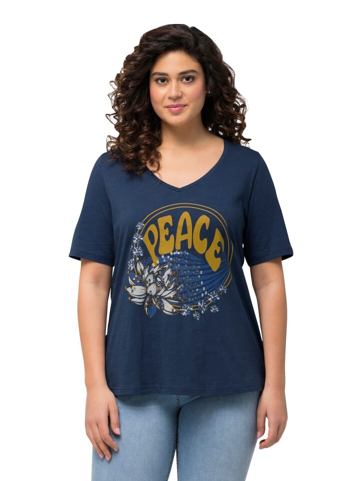 Футболка классического кроя из мягкого трикотажа с тонкой структурой. На принте блестящие пайетки. Округленный V-образный вырез, полурукава.