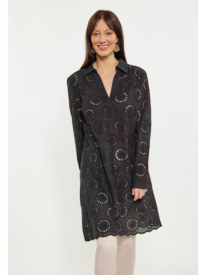 Это хлопковое платье с люверсами украшено кружевом Ришелье и замысловатыми вырезами. V-образный вырез и воротник добавляют изысканности, а силуэт А-силуэта создает непринужденную атмосферу бохо-шика. Длинные рукава с манжетами придают этому тканому платью изящный вид, создавая струящуюся драпировку для стильного образа.