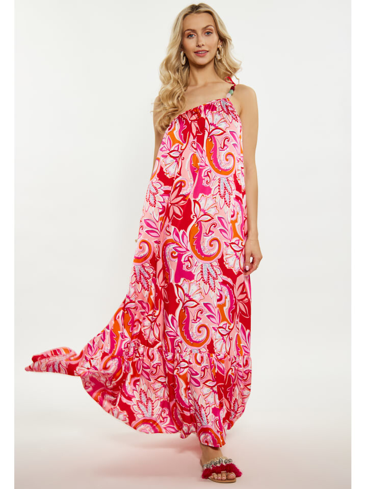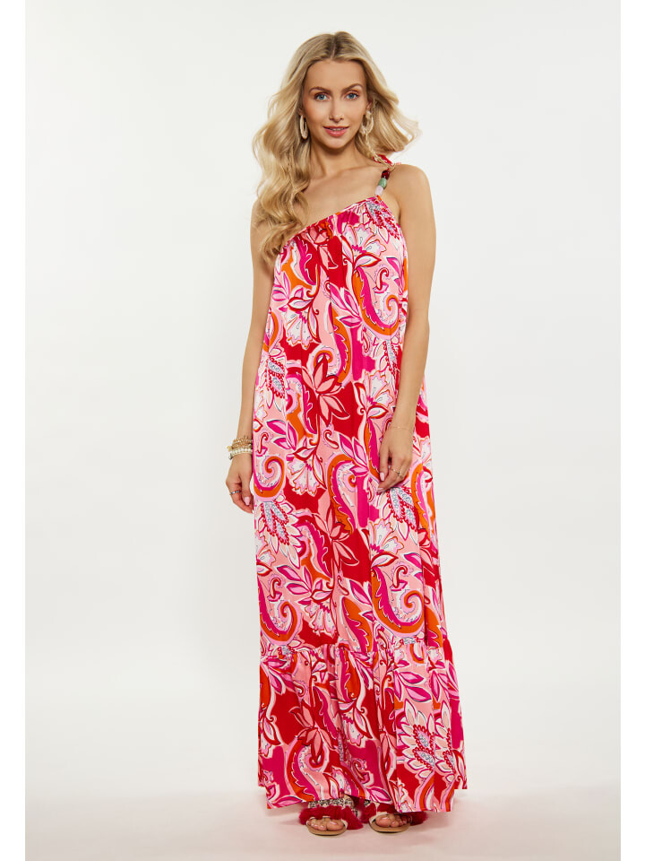 Улучшите свой гардероб этим потрясающим летним платьем макси с асимметричным принтом. Это изделие на одно плечо с приталенным поясом и расклешенным краем излучает элегантность. Замысловатые завитки и цветочные мотивы добавляют женственности, а рюши внизу придают текстуру и глубину. Идеально подходящее для официальных или полуофициальных мероприятий, это платье обязательно должно быть в гардеробе любой женщины.