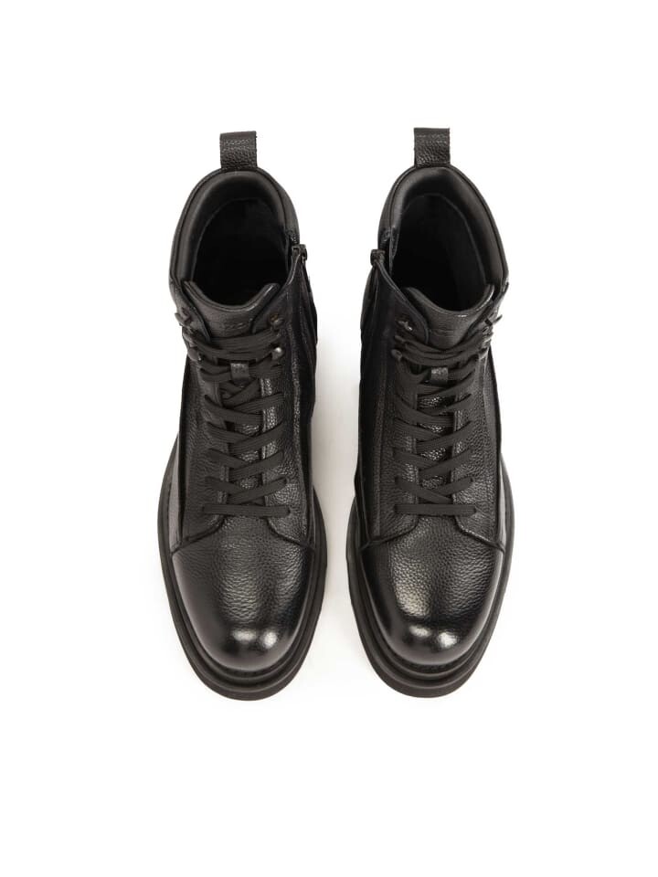 Черные ботинки из натуральной кожи имеют высокую шнуровку, обеспечивающую превосходную поддержку стопы и хорошую посадку. Сбоку голенища имеется молния, которая не только облегчает надевание обуви, но и обеспечивает современный стиль. Верхний материал украшен многочисленными швами, придающими обуви характерный, динамичный вид. Профильная подошва прочная и долговечная, обеспечивает хорошую поддержку и комфорт при ходьбе. На задней части голенища имеется петля, которая облегчает надевание обуви и придает ей дополнительный шарм.