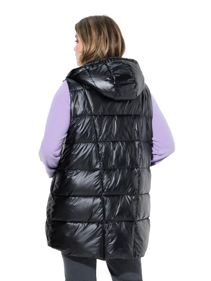 Длинная стеганая куртка А-силуэта в современном стеганом виде. Капюшон со стразами, застежка-молния, 2 кармана. Низ закругленный, сзади удлиненный. Внешний материал: 100 % полиамид. Подкладка: 100 % полиэстер.