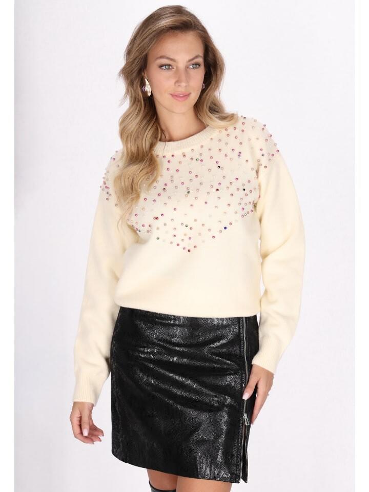 Откройте для себя стильный свитер с круглым вырезом и длинными рукавами. Этот свитер, украшенный очаровательным градиентным узором, излучает очарование. Разбросанные металлические детали придают дизайну блеск. Ребристые манжеты и ребристый пояс обеспечивают удобную посадку, а ребристый вырез горловины сохраняет форму. Идеально подходящий для прохладных дней, этот свитер сочетает в себе повседневный комфорт и декоративный стиль.