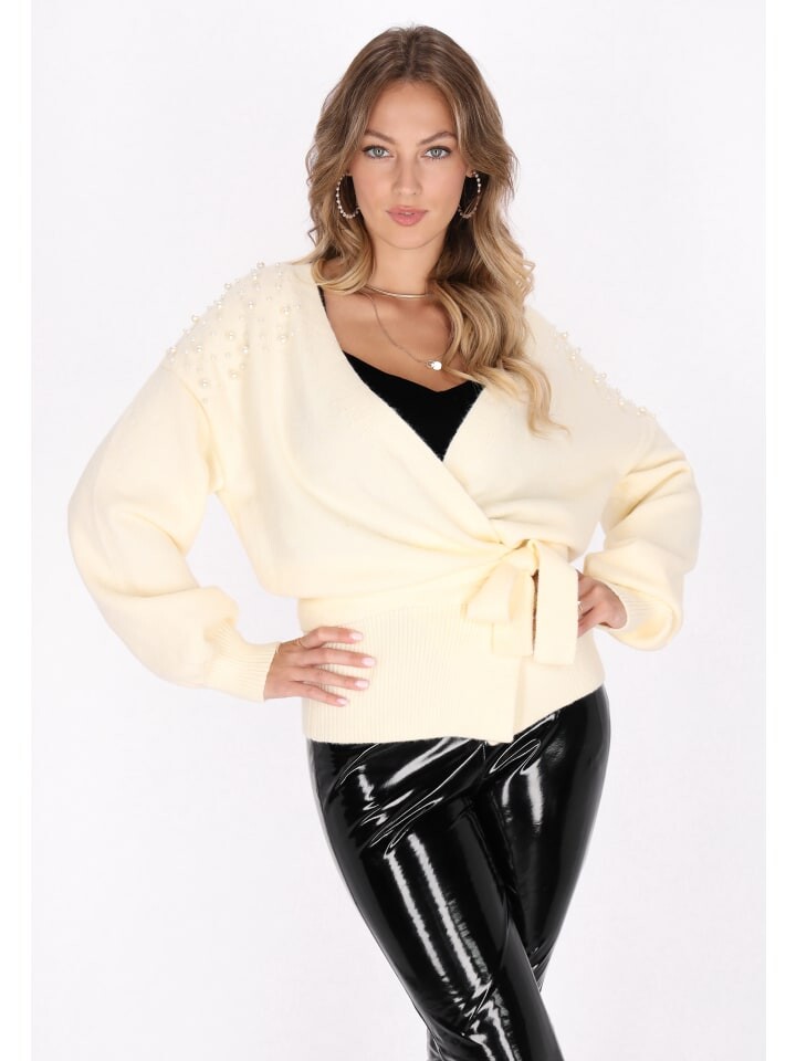 Этот вязаный свитер имеет изысканный дизайн с запахом и завязкой сбоку на талии. Оно излучает элегантность благодаря красивому V-образному вырезу и длинным рукавам. Декоративные детали на плечах придают образу гламурности. Ребристые манжеты и нижний край обеспечивают плотную посадку и подходят как для повседневных, так и для полуофициальных мероприятий. Удобное, но стильное дополнение к вашему гардеробу.