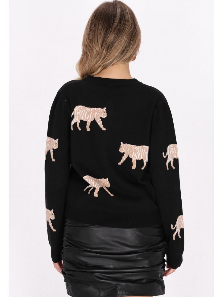 Раскройте свою дикую сторону с помощью этого привлекательного предмета одежды. Круглый вырез и длинные рукава создают классический силуэт, а разбросанные тигровые узоры добавляют дикий акцент. Планка с пуговицами спереди оснащена контрастными пуговицами, которые визуально подчеркивают изделие. Ребристые детали по низу, манжетам и вырезу обеспечивают плотную посадку - идеально подходят для ношения с любимыми нарядами.