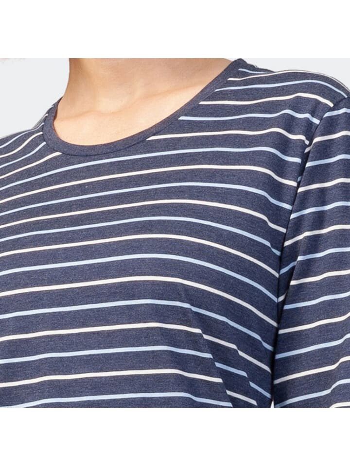Женская ночная рубашка Hajo из одинарного джерси. В климатическом комфорте качество. Наслаждайтесь чудесно сбалансированной средой для сна. Это функциональное волокно сочетает в себе преимущества удивительно мягкого мерсеризованного хлопка и простого в уходе полиэстера. В результате получается тонкий, шелковистый, блестящий материал, не гладкий, регулирующий температуру и дышащий. Пижама в трикотажные полоски имеет круглый вырез, манжеты и закругленный низ с окантовкой. Удобный крой и тщательная обработка создают хорошую основу для спокойного сна.