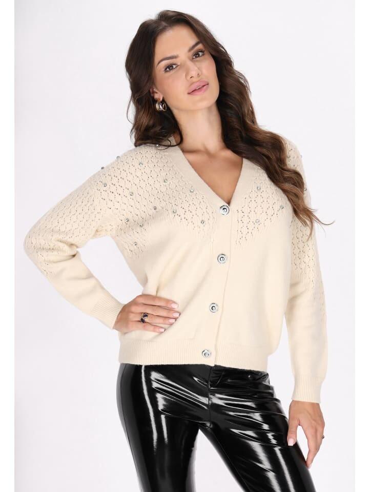 - Вязаный кардиган с V-образным вырезом и планкой на пуговицах