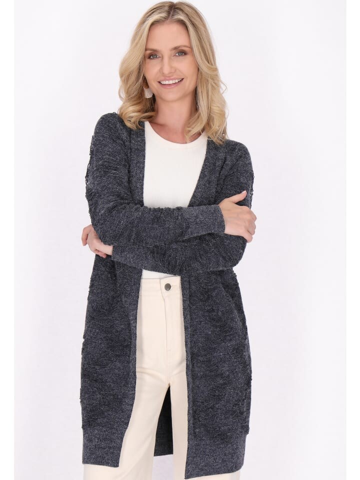 Этот кардиган длиной до колена станет универсальным дополнением вашего гардероба. Благодаря структурированному виду и слегка потертым краям он излучает непринужденный, но в то же время шикарный шарм. Открытая конструкция позволяет легко надевать несколько слоев одежды, а свободная посадка обеспечивает комфорт. Этот кардиган идеально подходит для придания непринужденной элегантности любому наряду. Он незаменим для всех, кто ценит сдержанный стиль с оттенком утонченности.
