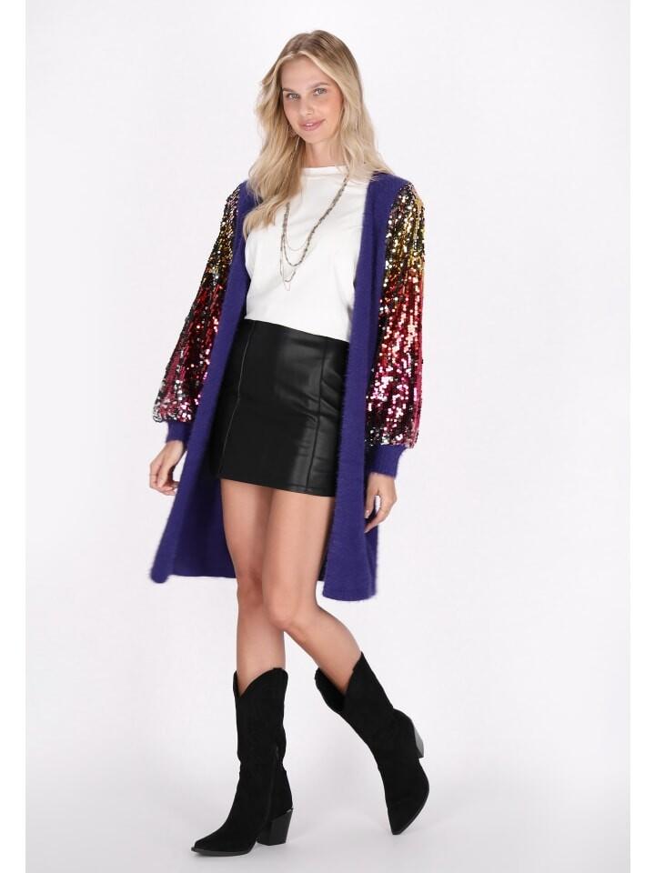 Поддайтесь очарованию этого вязаного платья — очаровательного ансамбля, в котором непринужденный стиль сочетается с праздничной элегантностью. Украшенное сверкающими пайетками, которые сияют от плеч до манжет, оно излучает мерцающее сияние. Округлый вырез в рубчик, манжеты и подол придают его непринуждённому силуэту нотку изысканности, обещая стиль и комфорт для любого случая.