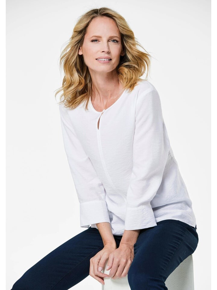 Блузка с круглым вырезом из слегка структурированной смесовой вискозы, создающей особенный образ. Вырез горловины имеет небольшую пуговицу и разрез, который переходит в декоративный шов. Рукава длиной 3/4 заканчиваются чуть более широкой манжетой и легко подворачиваются. Блуза немного удлиняется сзади, создавая скрывающий эффект. С боковыми разрезами для оптимальной свободы движений. Размер в длину около 69 см. 46, размер около 65 см. 23.