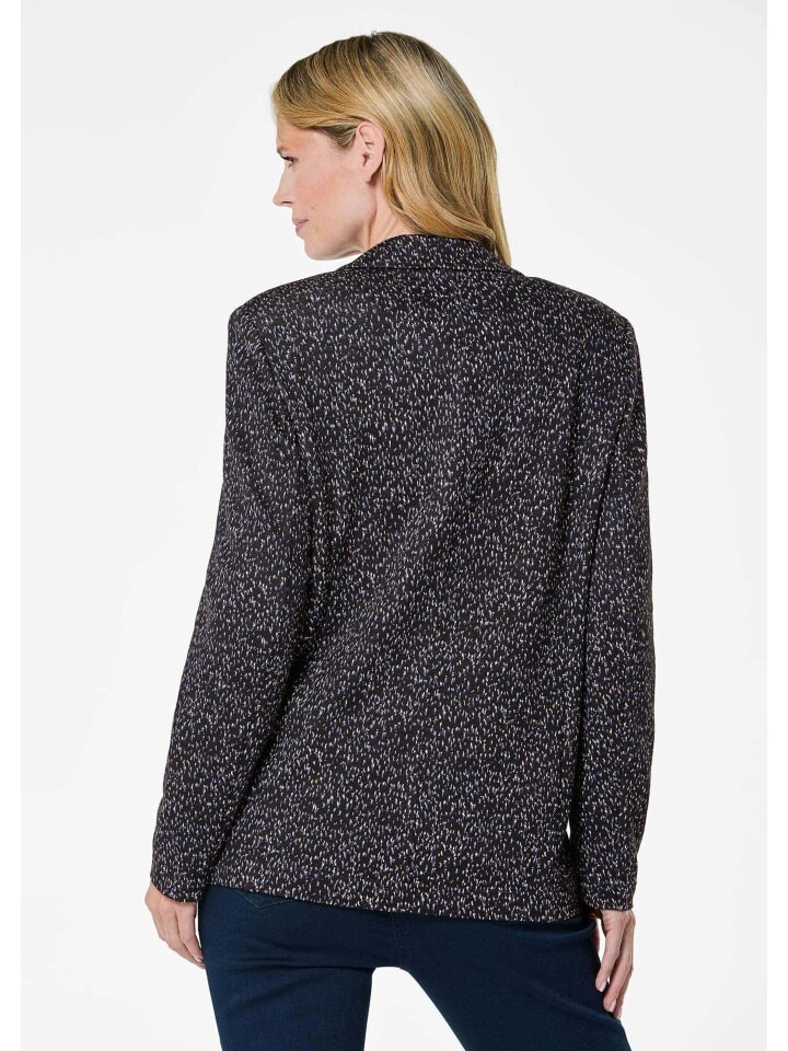 Блейзер с нежным многоцветным жаккардовым узором выглядит одновременно элегантно и современно. Лацканы с низкой застежкой на пуговицы визуально вытягивают силуэт, формирующие разделительные швы и прикрывающая бедра, скрывающая длину, подчеркивают женственную посадку. Обработка накладок внутри подчеркивает аккуратный вид. Дополнительные детали: практичные прорезные карманы, длинные рукава и закругленный край на подоле спереди. Модель без подкладки из высококачественного трикотажа с вискозой и эластаном особенно удобна в носке, обеспечивает свободу движений и является идеальным компаньоном для стильных и повседневных образов. Длина: размер около 70 см. 46, размер около 66 см. 23.