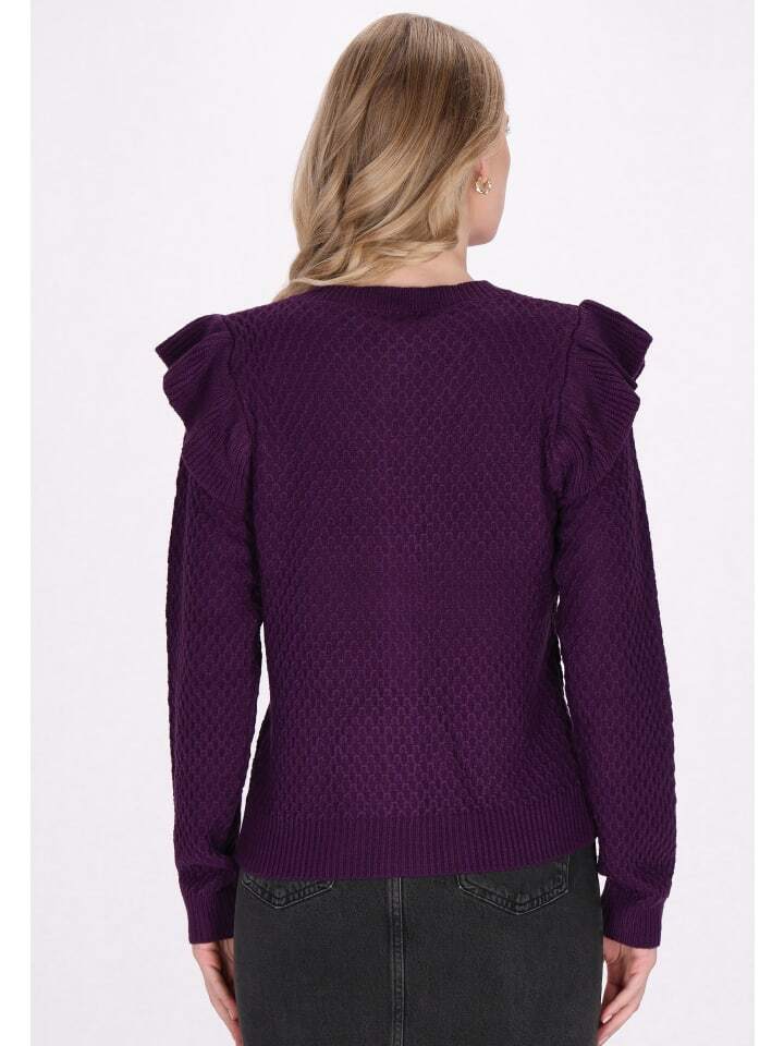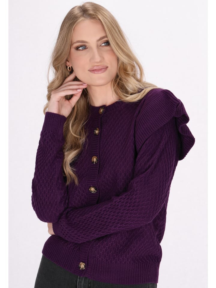 Кардиган имеет структурированный узор, круглый вырез горловины и планку на пуговицах спереди. Длинные рукава и рюши на плечах создают эффект оборок, а также ребристые манжеты и подол для более узкой посадки. Этот кардиган с простым дизайном без дополнительных украшений предлагает вневременной стиль и универсальность.