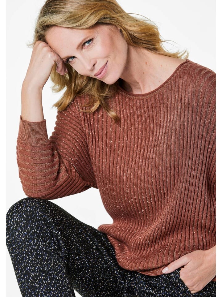 Пуловер с вырезом «лодочкой» и закругленным краем. Особая структура резинки достигается за счет чередования левых и правых рядов стежков, а также горизонтального расположения стежков. Рукава «летучая мышь» длиной 3/4, ребристая нижняя кромка и широкая посадка до бедра подчеркивают повседневный образ. Приятная мягкая вискоза с добавлением блестящей пряжи создает гламурный штрих, который также делает повседневную жизнь сияющей. Легко ухаживать, можно стирать в машине. Длина около 63 см. Размер 44/46, примерно 59 см. 22/23.