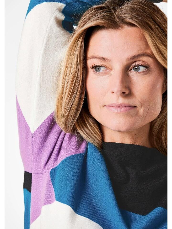 Вязаный свитер с контрастным узором интарсия. Мягкая смесь пряжи с содержанием вискозы приятна к коже и связана высококачественным трикотажем с уменьшением формы. Вырез-лодочка с плоской трикотажной вставкой подчеркивает плечи. Длина до бедра, с ребристыми манжетами и подолом. Безопасно для кожи и легко ухаживать. Длина около 67 см по размеру. 46, размер около 63 см. 23.