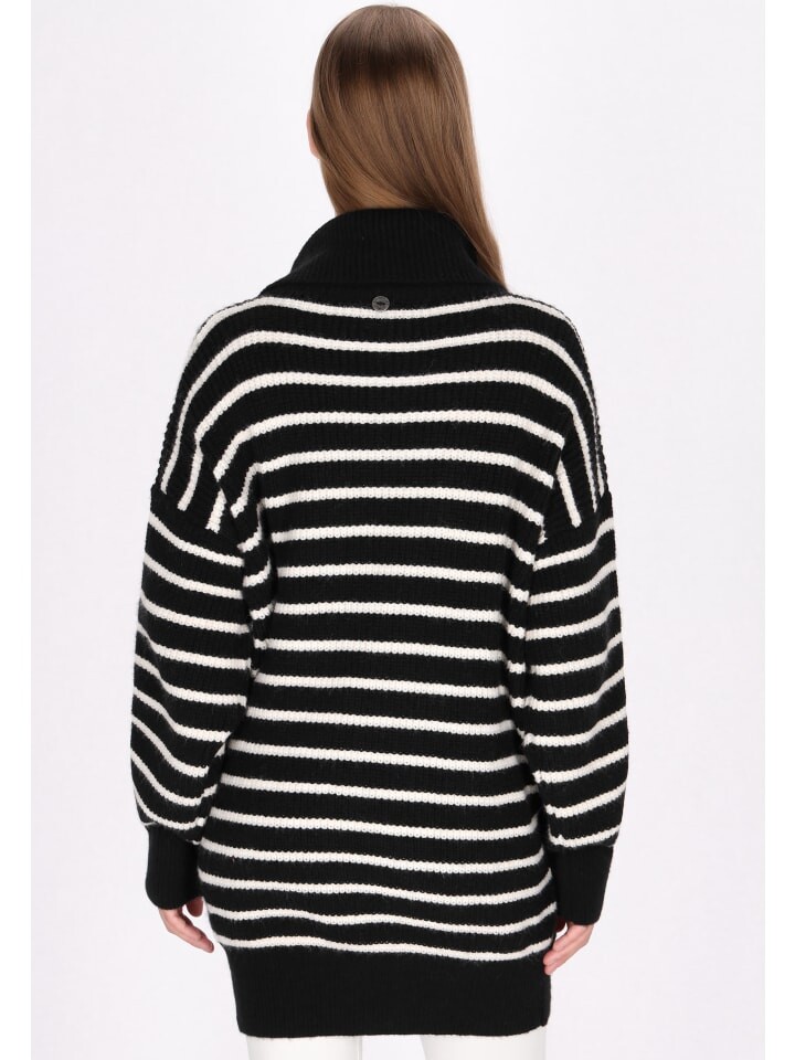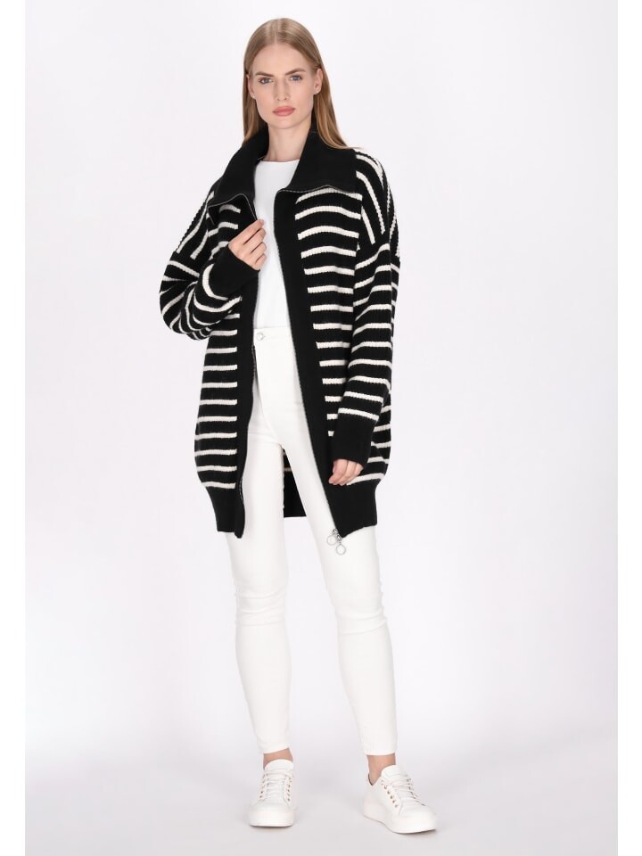 Этот кардиган украшен эффектным узором в горизонтальные полосы и стильно дополнен ребристым воротником, подолом и манжетами. Молния во всю длину с круглой подвеской придает ей современный вид. Толстый трикотаж сохраняет тепло, а свободный крой и длинные рукава с видимыми плечевыми швами добавляют дополнительных акцентов.