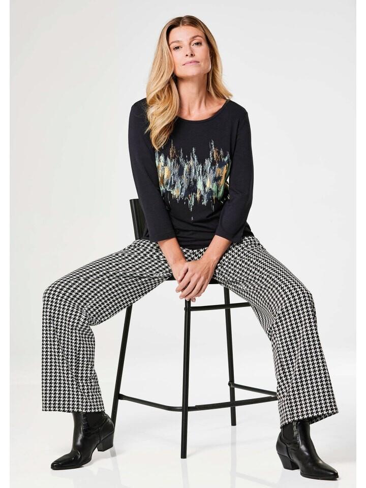 Рубашка с принтом спереди, привлекающим всеобщее внимание мерцающими акцентами из фольги. Женственный вырез-лодочка имеет узкую кайму, а края обработаны двойной строчкой. Длина до бедра и приятный вискозный трикотаж с эластаном гарантируют высокий уровень комфорта. Рукава 3/4 завершают модель. Длина около 64 см по размеру. 46, размер около 60 см. 23.