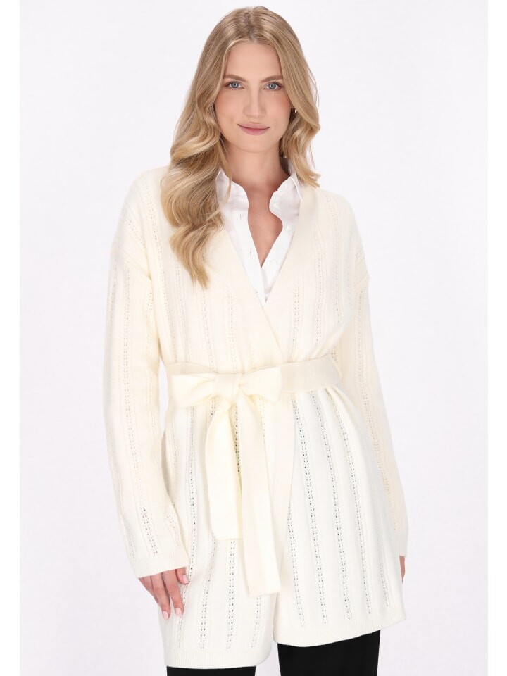 Это стильное и универсальное дополнение к вашему гардеробу имеет структурированный узор вязки, V-образный вырез и открытую переднюю часть. С помощью подходящего ремня вы можете закрепить эту уютную вещь, которая идеально добавит тепла и комфорта в ваш повседневный образ. Ребристая текстура по подолу, манжетам и передним краям придает дополнительную структуру этому повседневному, но шикарному изделию.