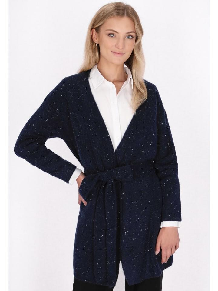 Подарите своему гардеробу новую жизнь с помощью этого стильного кардигана с длинными рукавами. Структурированная ткань поражает мелкими, равномерно распределенными крапинками и придает ей неповторимый вид. Глубокий V-образный вырез и передняя часть с запахом и завязывающимся поясом выгодно подчеркивают талию. Прямой низ доходит до середины бедра, обеспечивая комфорт и тепло в этом непринужденном силуэте - идеально подходит для прохладных дней.