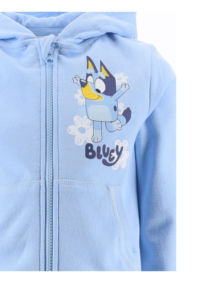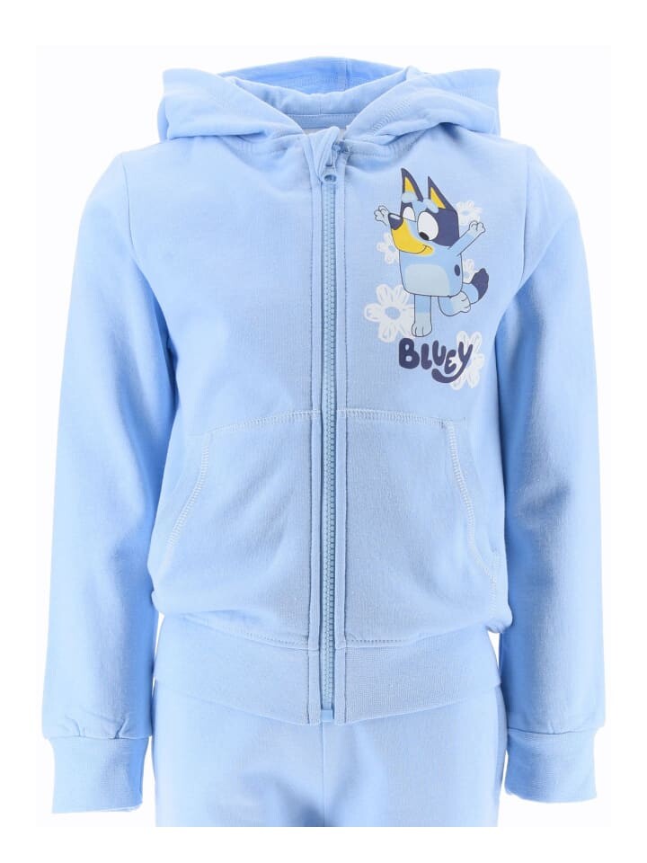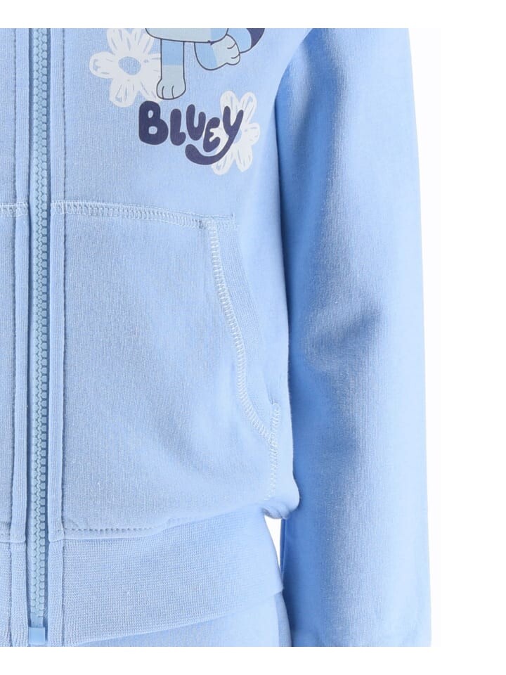 В дизайне спортивного костюма изображен популярный персонаж Блуи, олицетворяющий радость и жажду приключений. Толстовка имеет практичный капюшон, эластичные манжеты и два кармана, а брюки имеют удобную посадку на эластичном поясе.
