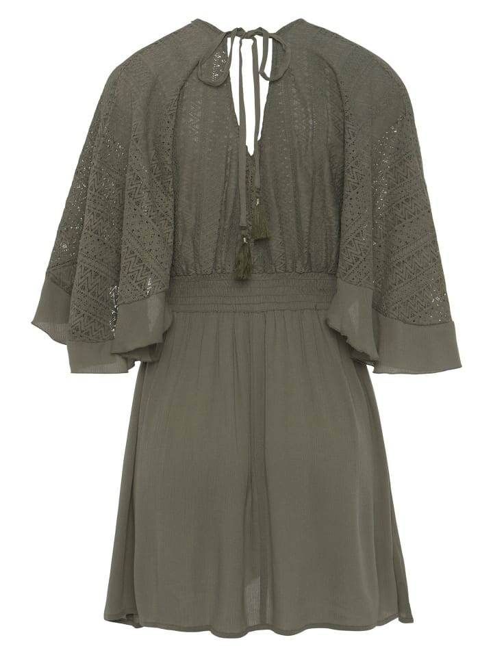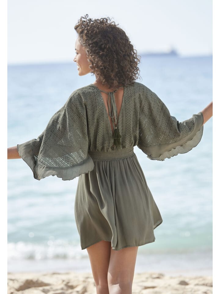 Легкое мини-платье от Lascana. Прозрачный кружевной топ с вырезом Cache Coeur спереди и V-образным вырезом сзади. Завязывается кистями на шее. Широкие рукава 7/8. Дымчатая вставка на талии. Для отдыха и досуга. Струящаяся ткань.