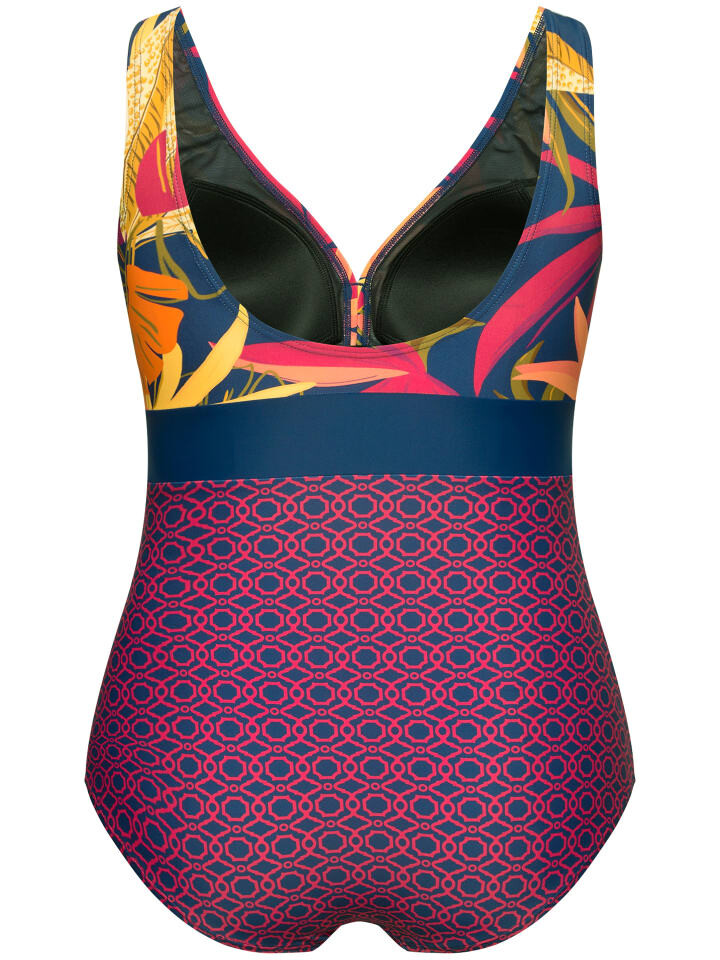 Купальник с мягкими чашками и бюстом с цветным принтом в виде листьев, декоративным поясом и минималистичным узором. Завышенный крой для красивых и длинных ног. Поддерживающая лента под грудью, подкладка спереди. Изготовлено из переработанного полиамида.